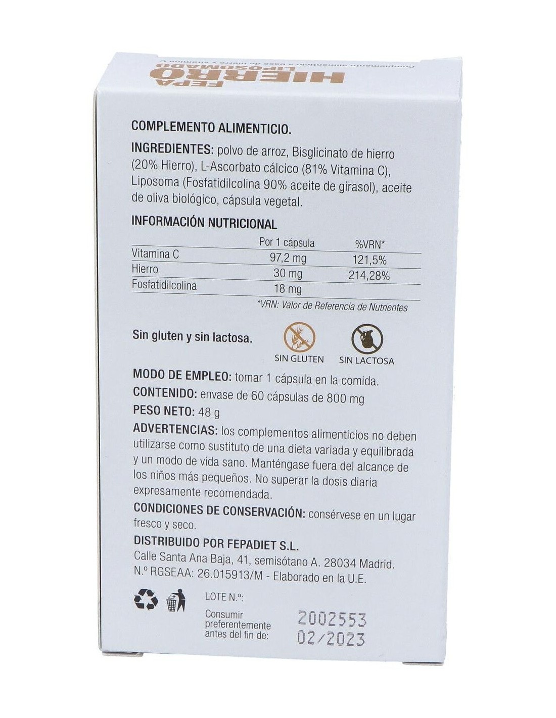 Polvo de arroz, bisglicinato de hierro (20% de hierro), ascorbato de calcio, cobertura (gelatina vegetal), fosfatidilcolina (90%), aceite de oliva biológico, antiaglomerante (estearato de magnesio).
