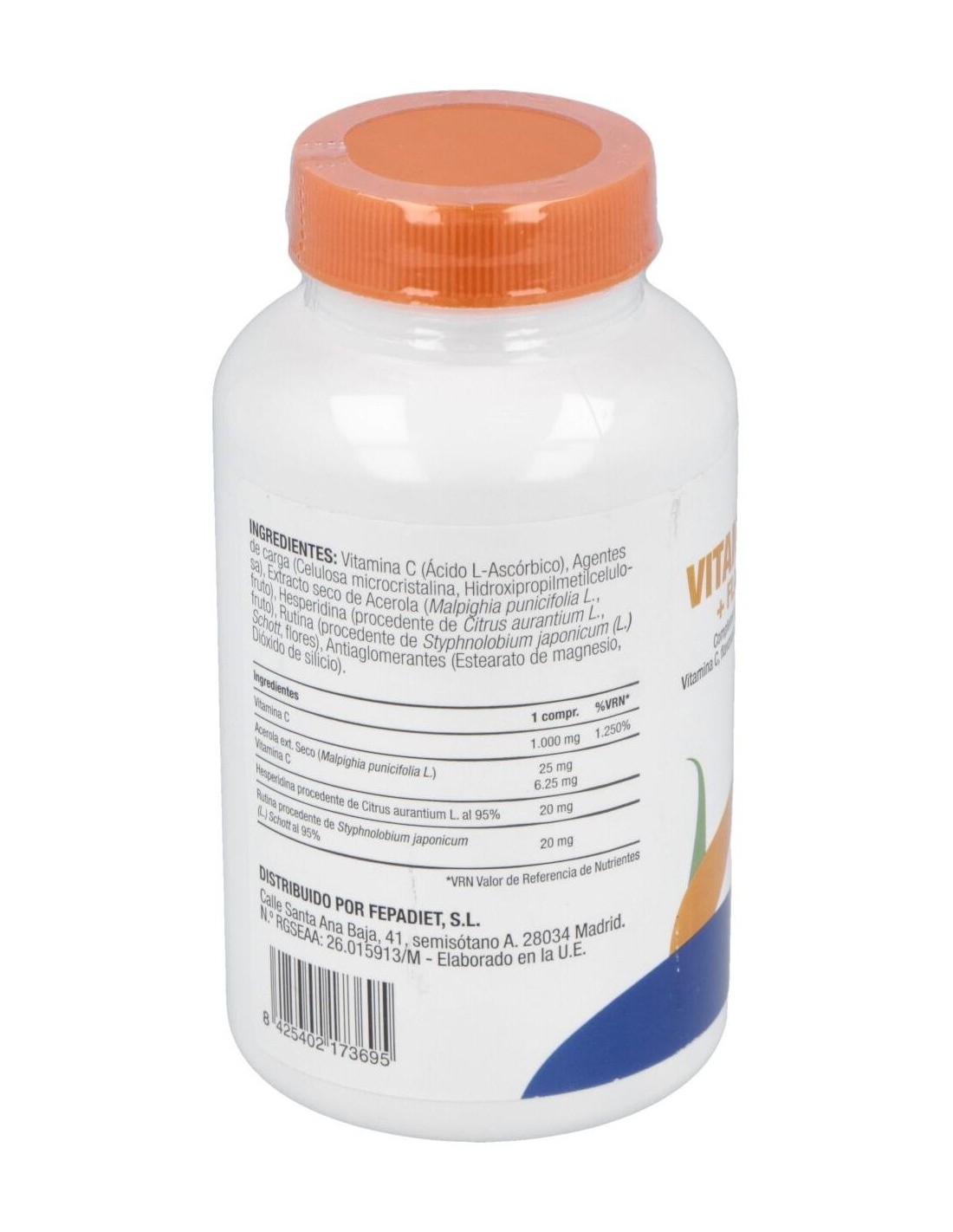 Vitamina C (Ácido L-Ascórbico), Agentes de carga (Celulosa microcristalina, Hidroxipropilmetilcelulosa), Extracto seco de Acerola (Malpighia punicifolia L., fruto), Hesperidina (procedente de Citrus aurantium L., fruto), Rutina (procedente de Styphnolobium japonicum (L.) Schott, flores), Antiaglomerantes (Estearato de magnesio, Dióxido de silicio).