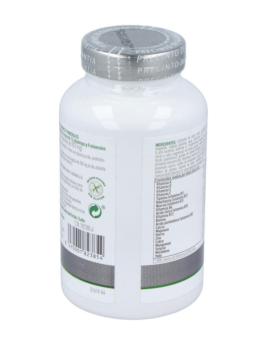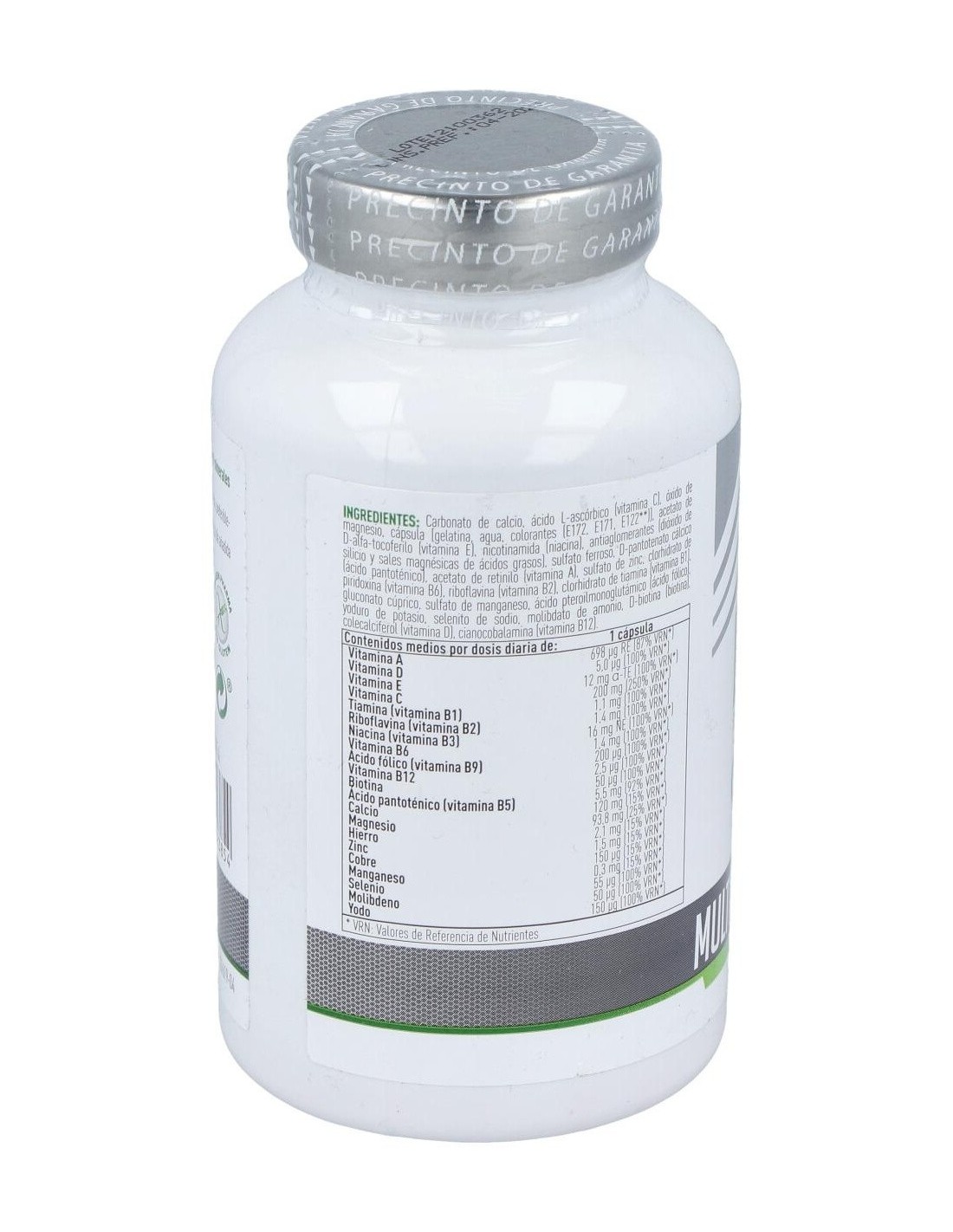 POR CÁPSULA: VITAMINA A (RETINOL): 698 MCG, VITAMINA D3 (COLECALCIFEROL): 5 MCG, VITAMINA E (TOCOFEROL): 12 MG, VITAMINA C (ÁCIDO ASCÓRBICO): 200 MG, VITAMINA B1 (TIAMINA): 1,1 MG, VITAMINA B2 (RIBOFLAVINA): 1,4 MG, VITAMINA B3 (NIACINA): 16 MG, VITAMINA B6 (PIRIDOXINA): 1,4 MG, VITAMINA B9 (ÁCIDO FÓLICO): 200 MCG, VITAMINA B12 (CIANOCOBALAMINA): 2,5 MCG, BIOTINA: 50 MCG, ÁCIDO PANTOTÉNICO: 5,5 MG, CALCIO: 120 MG, HIERRO: 2,1 MG, MAGNESIO: 93,8 MG, COBRE: 150 MCG, ZINC: 1,5 MG, MANGANESO: 0,3 MG, IODO: 150 MCG, MOLIBDENO: 50 MCG, SELENIO: 55 MCG.