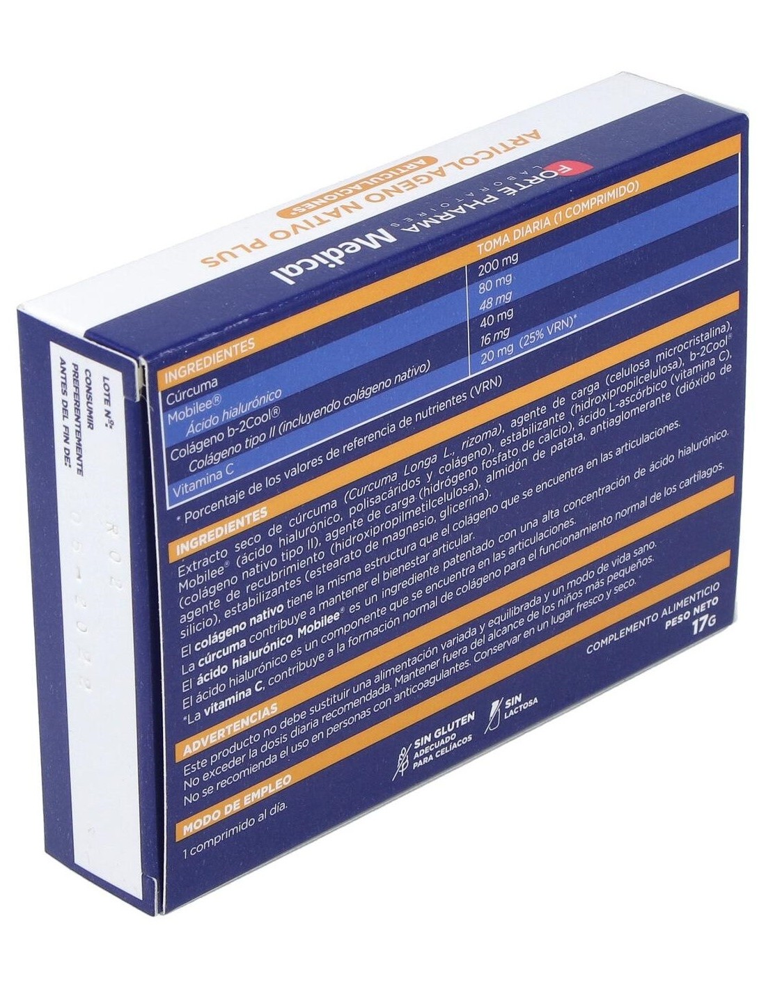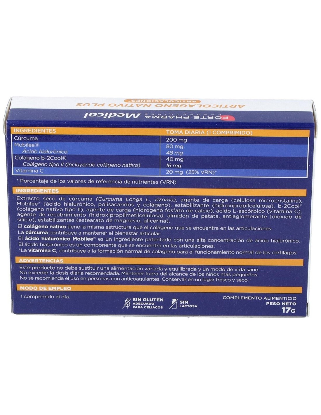 Colágeno nativo tipo II (b-2Cool®), ácido hialurónico (Mobilee®), cúrcuma y vitamina C. Excipientes.