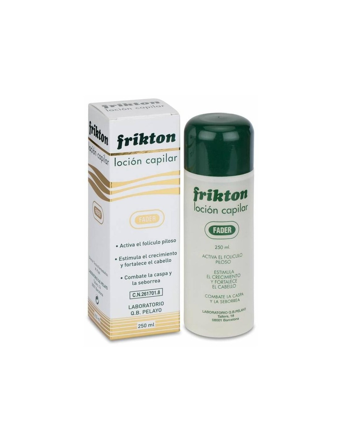 FRIKTONEl uso frecuente de Frikton Loción, ayuda a prevenir la pérdida precoz del cabello, ya que el Tusílago, la Aquilea y la Quina, forman un nutritivo complejo tricógeno, que actúa especialmente en la fase de crecimiento del cabello, facilitando su irrigación y regeneración. El Tioxolone se complementa con el Piroctone Olamine formando un tándem eficaz, al regular el exceso de secreción grasa del cuero cabelludo, combatiendo también el exceso de descamación del mismo y minimizando así la formación de la caspa. La aplicación diaria con fricción o masaje con la yema de los dedos sobre toda la superficie de las raíces del cabello, especialmente en las zonas más afectadas, es la clave para un resultado satisfactorio del producto.