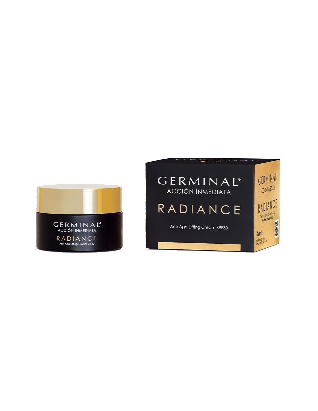 GERMINALCrema antiedad con efecto lifting inmediato para una piel firme al instante y radiante cada día. Para todo tipo de pieles a partir de 40 años que buscan mejorar el aspecto de la piel de forma inmediata y duradera, borrando los signos de fatiga y estrés, aportando firmeza y luminosidad a diario. Dirigido a consumidoras preocupadas por el paso de los años y por el envejecimiento prematuro de su piel. Protección solar 30 SFP.