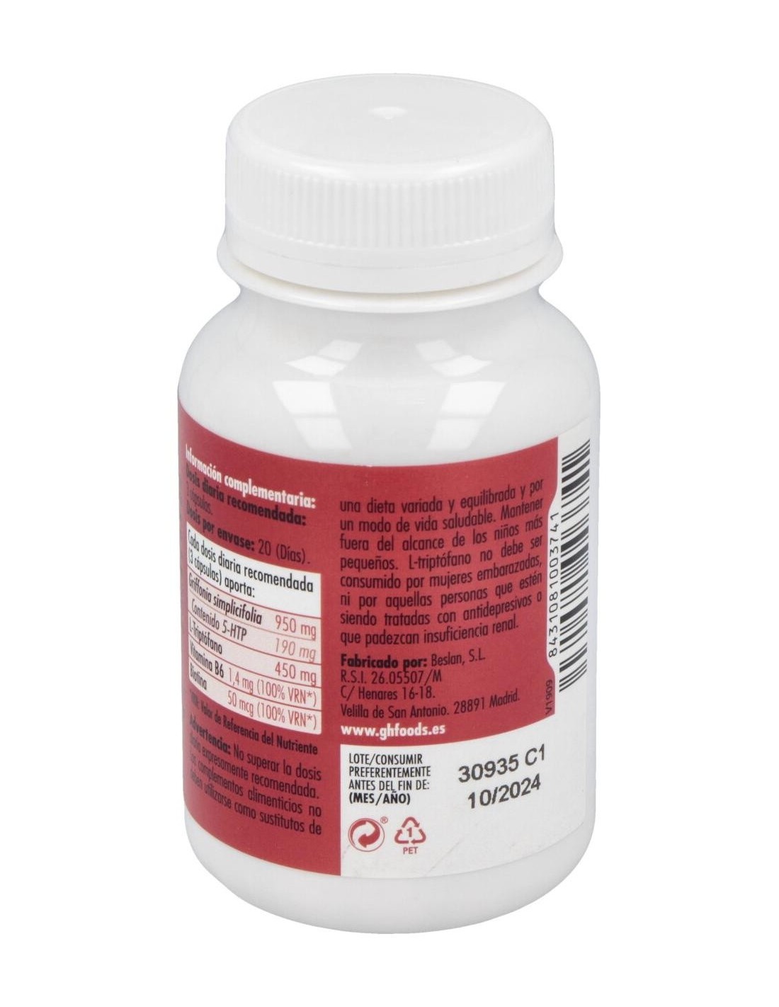 GHFEl Triptofano 5Htp+B6 60Cap. de Ghf es un suplemento nutricional dirigido a personas que buscan apoyar el bienestar emocional, combinando triptófano y vitamina B6 para contribuir a la síntesis de neurotransmisores.