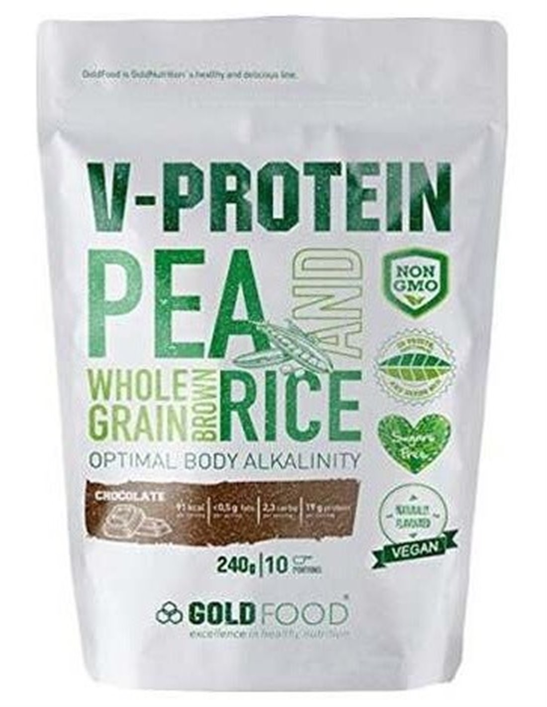 GOLD NUTRITIONVegan V-Protein GoldNutrition® es un producto rico en proteínas vegetales (72-78%) provenientes del guisante y del arroz, lo que permite que su composición incluya todos los aminoácidos esenciales para el organismo, sin azúcares añadidos, contiene menos de 1 g de azúcar por batido. Esta fórmula ha sido enriquecida con bromelina, una enzima natural extraída de la piña, que permite optimizar la digestión de las proteínas. Tiene efecto saciante y ayuda a controlar el apetito.