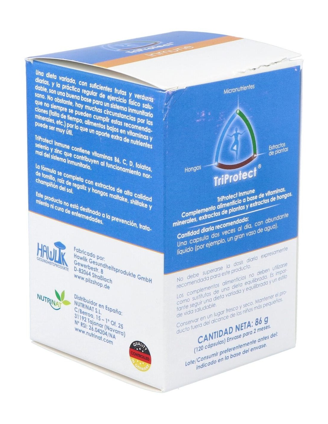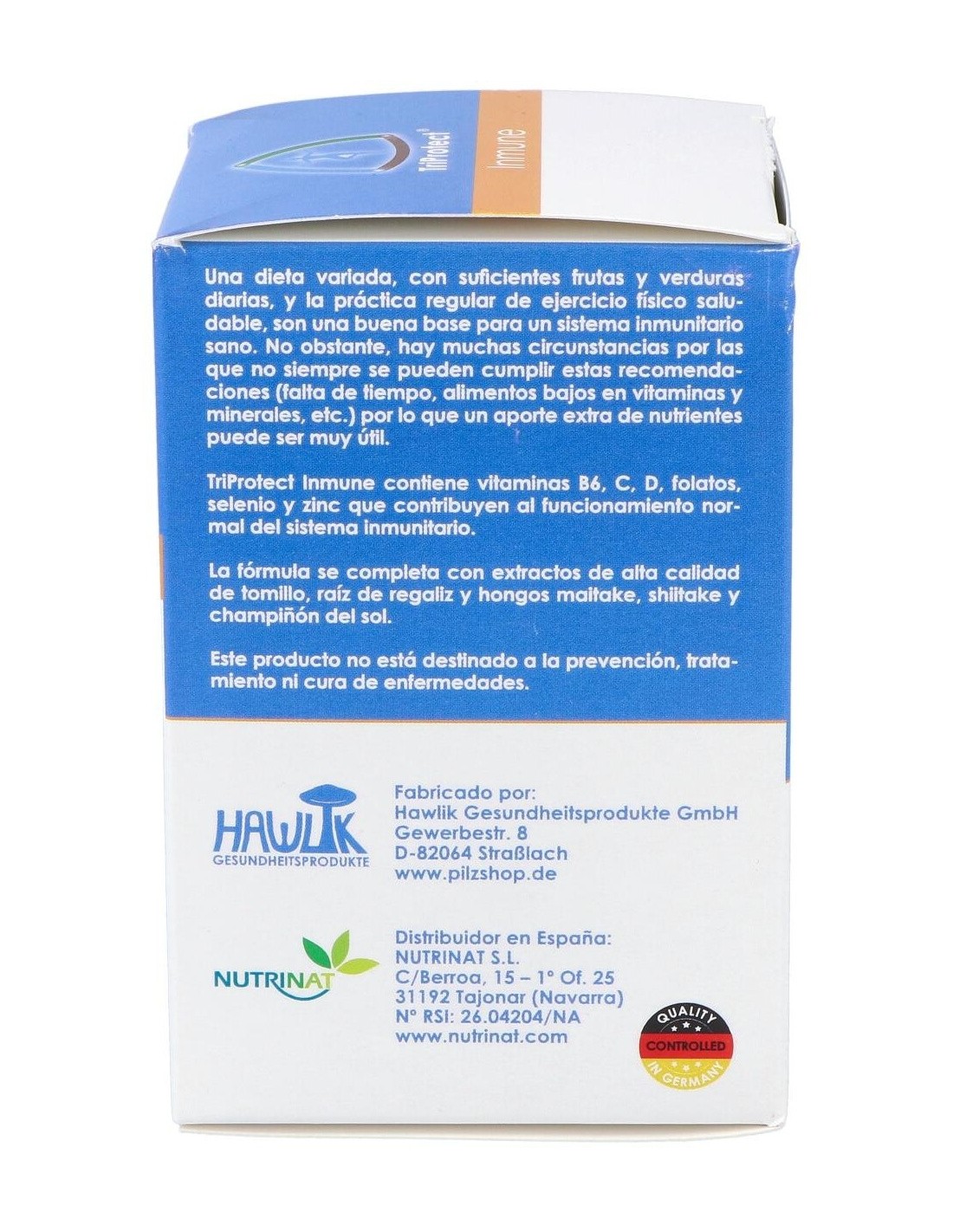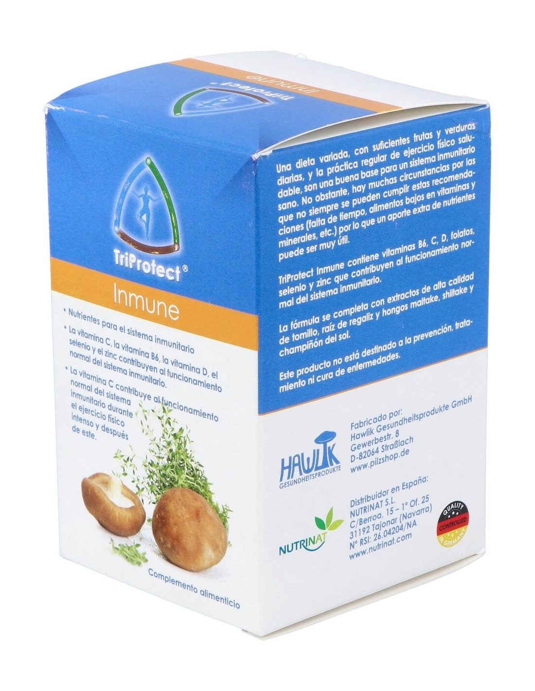 Inmune de Hawlik s un complemento alimenticio que proporciona al sistema de defensa del organismo los nutrientes esenciales, seleccionados especificamente para apoyar las defensas inmunológicas del cuerpo y contribuir al bienestar general. Inmune es una formulación innovadora formulada especificamente para las necesidades de nuestro sistema inmunológico, indicado en casos de inmunodepresión, infecciones frecuentes, prevención de infecciones e infecciones activas.Combina los extraordinarios beneficios de los hongos Champiñón del sol (Agaricus blazei), Maitake (Grifola frondosa) y Shiitake (Lentinula edodes), con extractos de hoja de tomillo (Thymus vulgaris) y raíz de regaliz (Glycyrrhiza glabra), junto con el aporte de otros nutrientes esenciales como las vitaminas B6, C, E, D y ácido fólico, así como los minerales selenio y zinc.Propiedades: