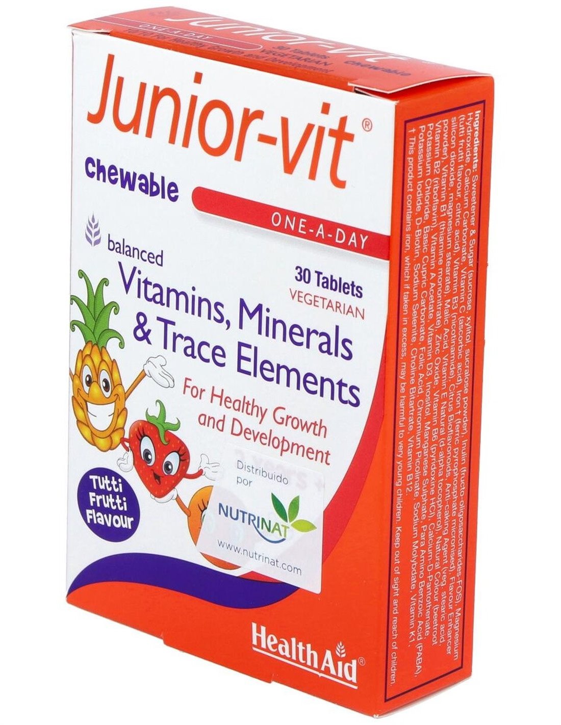 Junior Vit 30Comp. Health Aid de Health Aid es un suplemento diseñado para apoyar el bienestar general en niños, ideal para quienes buscan complementar su alimentación diaria con nutrientes esenciales. Su formulación está pensada para contribuir al desarrollo saludable durante las etapas de crecimiento.