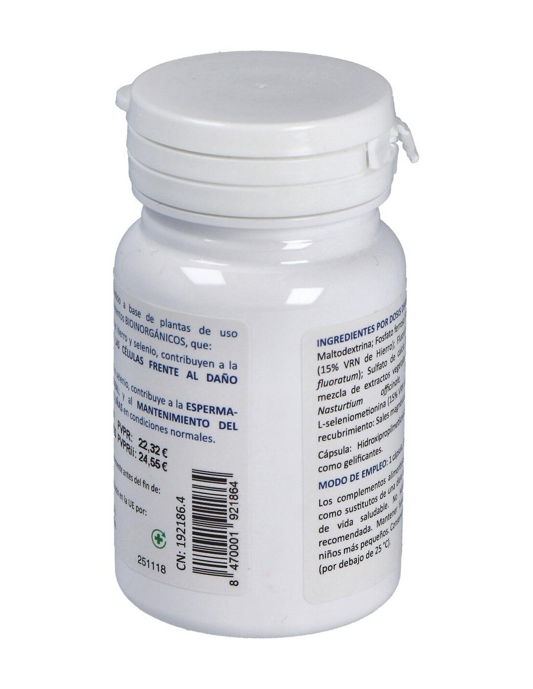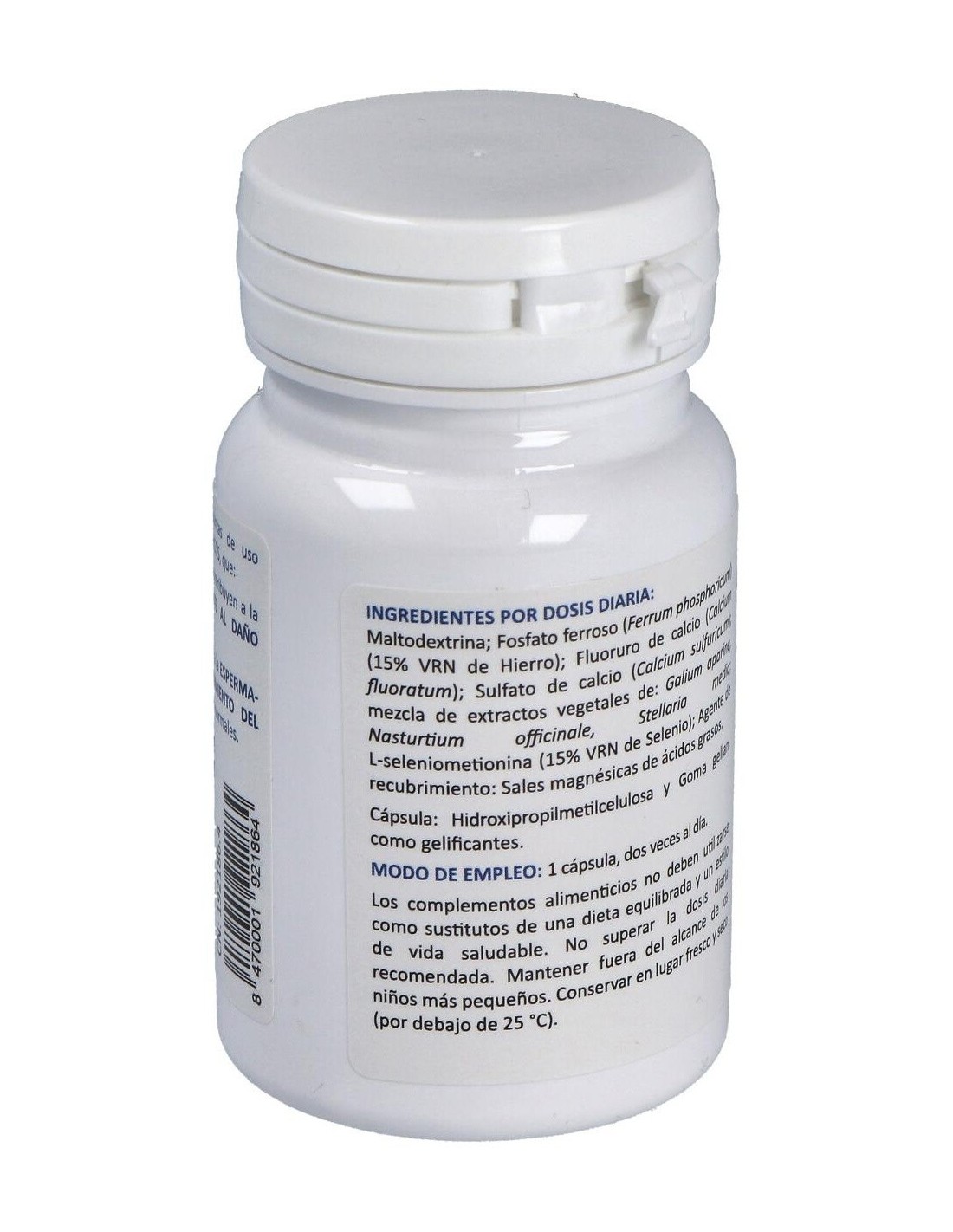 Maltodextrina: Fluoruro de calcio (Calcium fluoratum): Sulfato de calcio (Calcium sulfuricum): mezcla de extractos vegetales de: Galium aparine, Nasturtium officinale, Stellaria media: Fosfato ferroso (Ferrum phosphoricum) (15% VRN de Hierro): Lseleniometionina (15% VRN de Selenio): Agente de recubrimiento: Sales magnésicas de ácidos grasos.