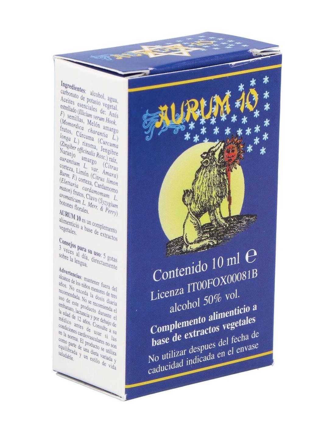 Aurum 10 es un complemento alimenticio a base de extractos vegetales. La centella asiática contribuye a la funcionalidad de la microcirculación (piernas pesadas), a la memoria y funciones cognitivas. El anis estrellado, el cardamomo y el limón contribuyen a la función digestiva, a la regularidad de la motilidad gastrointestinal y a la eliminación de los gases.No podemos olvidar su contribución en la fluidez de las secreciones bronquiales, y en el bienestar de la nariz y la garganta. El jengibre contribuye a la función digestiva, a la regular motilidad gastrointestinal y eliminación de gases. Tiene acción contra las náuseas. Contribuye a la funcionalidad regular del sistema cardiovascular y a la circulación normal de la sangre. Ayuda la funcionalidad articular y contrarresta las perturbaciones del ciclo menstrual.La diferencia que hay entre el Aurum 10 y el Aurum celesta es que el primero está concentrado el doble respecto al segundo en cuanto que el Aurum 10 a sido sometido a una dilución de 1/10, mientras que el Aurum celesta ha sido sometido a una dilución de 1/20.Ingredientes:Alcohol, agua, carbonato de potasio vegetal. Aceites esenciales de: Anís estrellado (Illicium verum Hook. F) semillas, Melón amargo (Momordica charantia L.) frutos, Cúrcuma (Curcuma longa L.) rizoma, Jengibre (Zingiber officinalis Rosc.) raíz, Naranjo amargo (Citrus aurantium L. var. Amara) corteza, Limón (Citrus limon Burm. F.) corteza, Cardamomo (Elettaria cardamomum L. aton) frutos, Clavo (Syzygium aromaticum L. Merr. & Perry) botones florales.Alcohol 50% vol.Modo de empleo:Tomar 5 gotas, 3 veces al día, directamente sobre la lengua.Presentación:Envase de 10 ml.