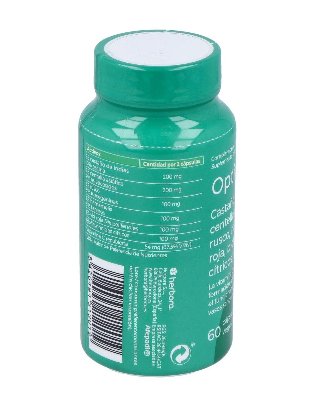 Ma´s de la mitad de la poblacio´n adulta padece insuficiencia venosa, una afeccio´n en la que las venas tienen dificultades para retornar la sangre de las piernas al corazo´n.Opticir facilita el correcto funcionamiento del sistema circulatorio, siendo un tratamiento preventivo y de mejora para problemas circulatorios. Combina en su fo´rmula castan~o de Indias, centella asia´tica, rusco, hamamelis y vid roja, junto con los bioflavonoides ci´tricos y la vitamina C.Con efecto analge´sico y antiinflamatorio, actu´a sobre los vasos sangui´neos, evitando la mala circulacio´n de la sangre y el efecto de piernas cansadas y pesadas.Indicaciones: