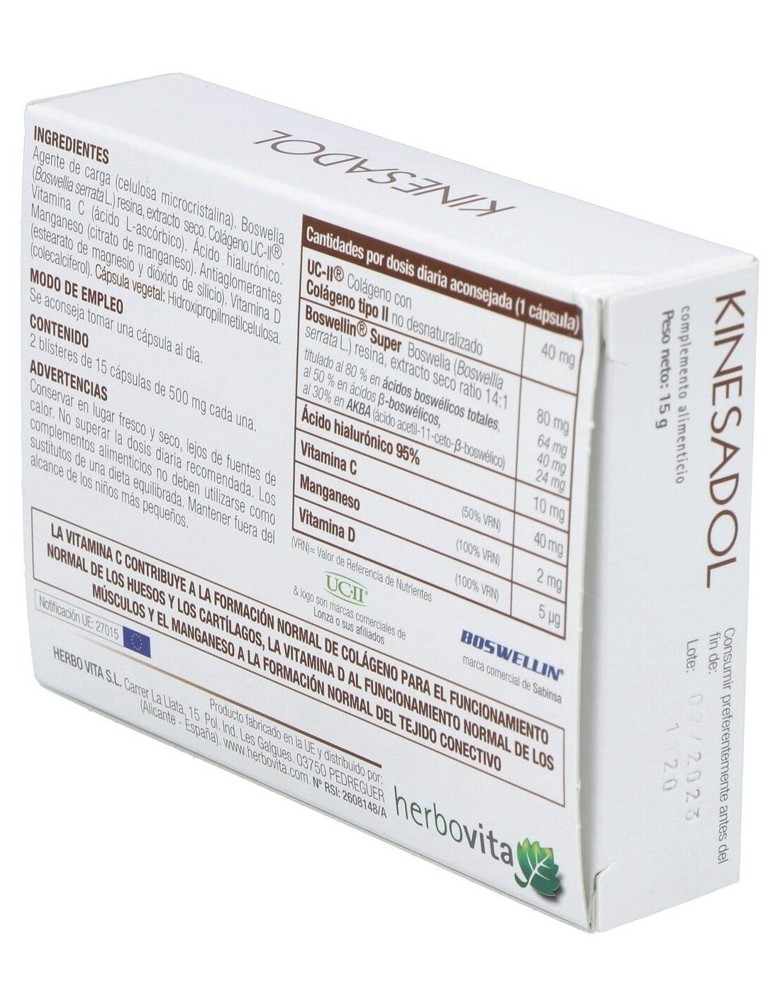 Boswellin (80 mg), Vitamina C (40 mg), Ácido Hialurónico (10 mg), Vitamina D (5 µg), Manganeso (2 mg).