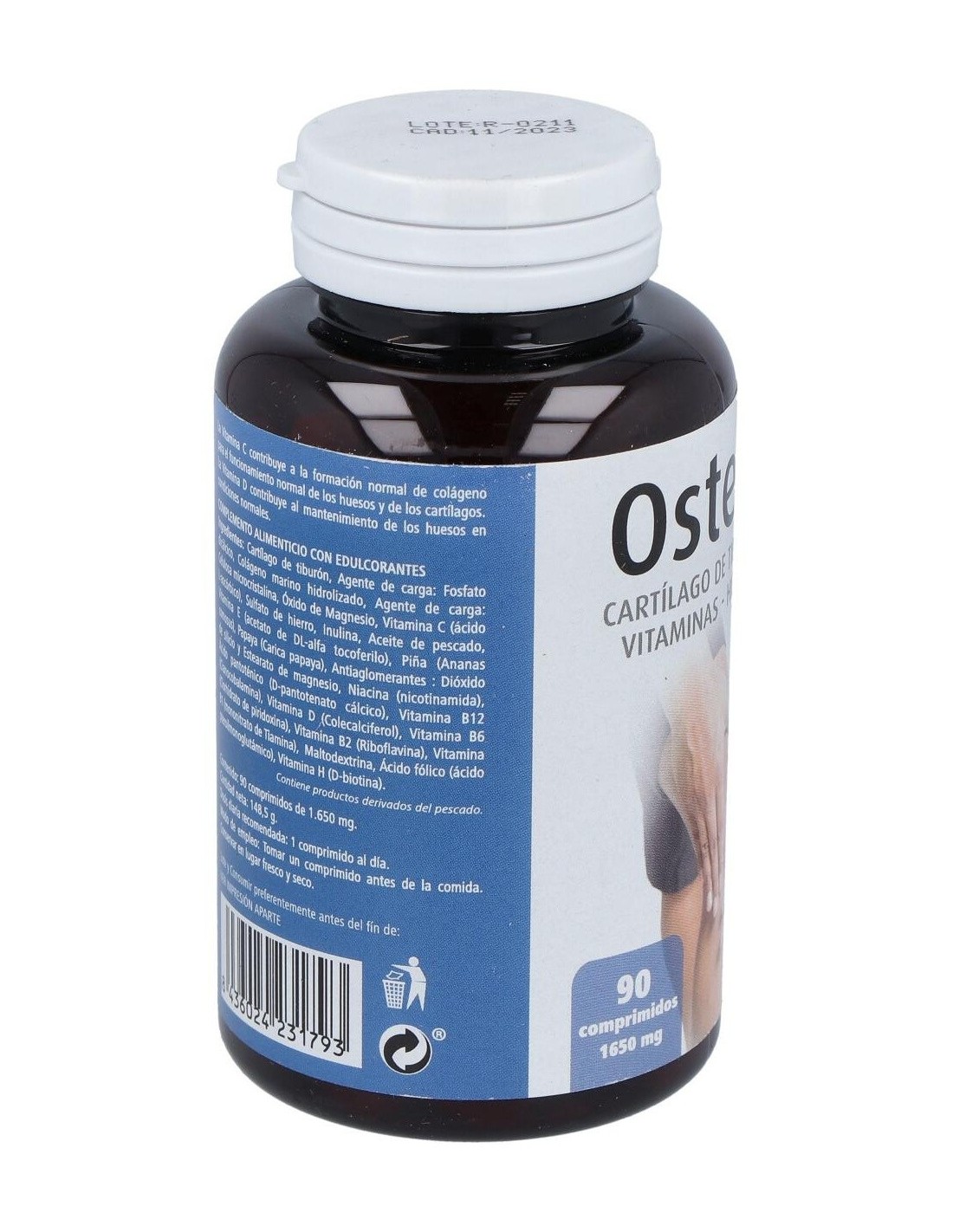 Cartílago de Tiburón 500 mg, Fosfato de Calcio 330 mg, Colágeno marino 200 mg, Celulosa microcristalina, Inulina 100 mg, Sulfato de Hierro 70 mg, Vitamina C 60 mg, Gluconato de Magnesio 50 mg, Omega-3 de Manzana en forma de ALA (Ac. Alfa linolénico) 50 mg, Piña 25 mg, Papaya 25 mg, Vitamina E, D-Pantetonato Cálcico, Vitamina B6, VVitamina B2, Vitamina B1, Acido Fólico, D-Biotina, Vitamina D, Vitamina B12.