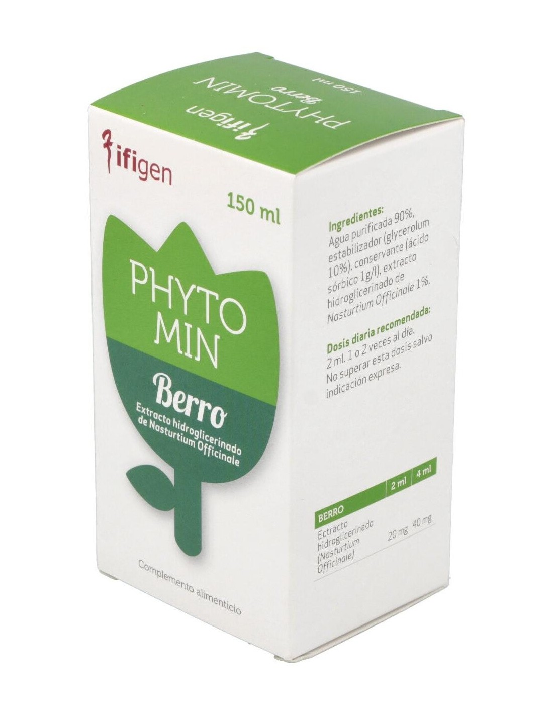 Phyto-Min Berro 150Ml. de Ifigen es un complemento natural diseñado para personas que buscan apoyar su bienestar diario mediante ingredientes de origen vegetal. Su formulación está pensada para integrarse fácilmente en rutinas de cuidado personal, aportando nutrientes específicos derivados del berro.