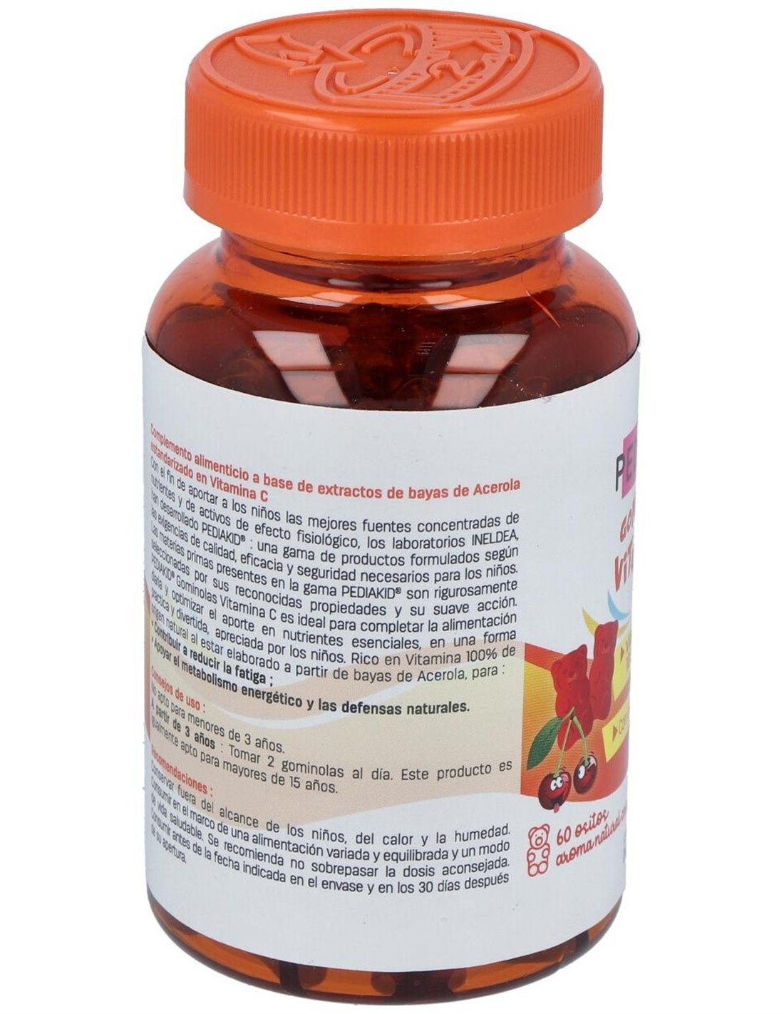 Complemento alimenticio en forma de gominolas a base de extracto de bayas de Acerola titulado en Vitamina C, con extracto de bayas de Acerola, rico en Vitamina C 100% de origen natural de biodisponibilidad óptima, las Gominolas Vitamina C de Pediakid® permiten cubrir el 100% de los aportes de referencia en Vitamina C y así contribuir a la reducción de la fatiga y al mantenimiento del metabolismo energético y de las defensas naturales del organismo.Composición activa por 2 gominolas:368 mg de extracto de bayas (80 mg de vitamina C).Ingredientes:Sirope de glucosa, azúcar de caña cristalizado, extracto de bayas de Acerola titulado en Vitamina C, aromatizante natural, colorante natural: concentrado de zanahoria, agente de recubrimiento: cera de carnauba (aceites de coco y de colza).Modo de empleo:Desde los 3 años. 2 gominolas al día. También puede ser conveniente para mayores de 15 años.Presentación:Envase de 60 gominolas masticables.Recomendaciones y advertencias:No contiene gelatina, conservantes, gluten, lactosa, sabores o colorantes artificiales.