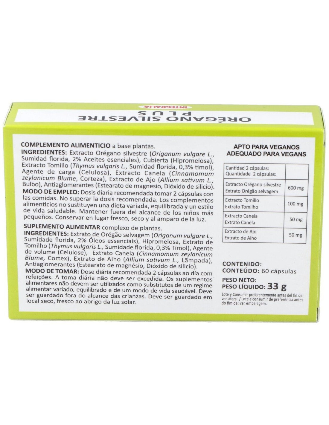 INTEGRALIAComplemento alimenticio en forma de cápsulas, elaborado a base de extractos naturales de orégano silvestre, tomillo, canela y ajo, que favorecen el bienestar general del organismo.Aporta propiedades antisépticas, antifúngicas y antibacterianas, que favorecen la buena salud del sistema digestivo y ayudan a reforzar las defensas del sistema inmunitario.