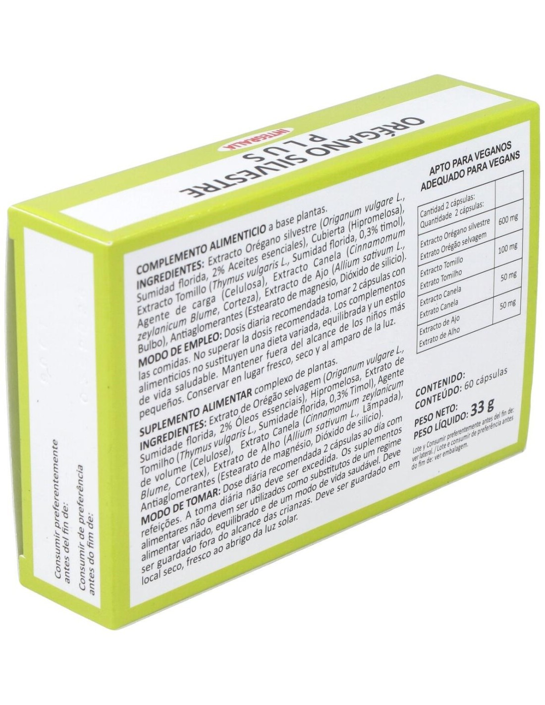 Complemento alimenticio en forma de cápsulas, elaborado a base de extractos naturales de orégano silvestre, tomillo, canela y ajo, que favorecen el bienestar general del organismo.
