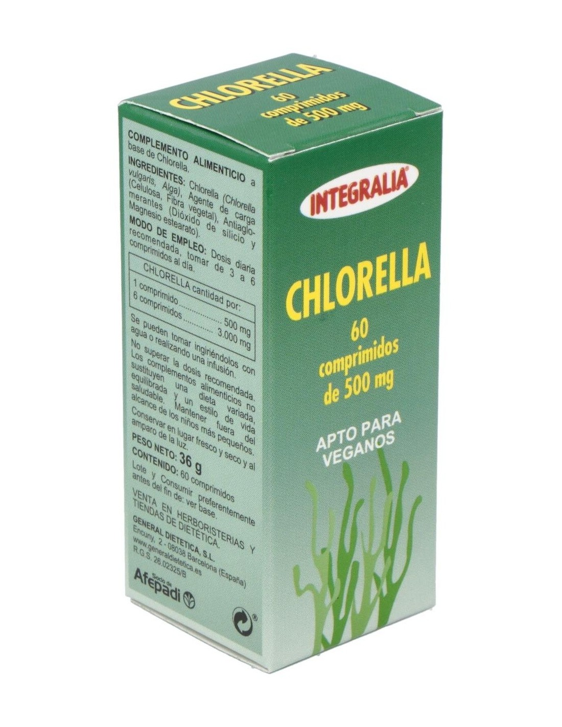 Chlorella 500Mg. 60Comp. de Integralia es un suplemento alimenticio diseñado para personas interesadas en complementar su dieta con ingredientes de origen natural. Es adecuado para quienes buscan apoyar su bienestar general mediante una fórmula basada en microalgas.