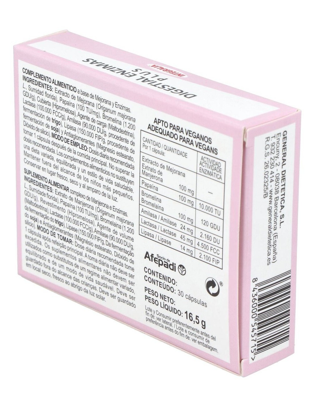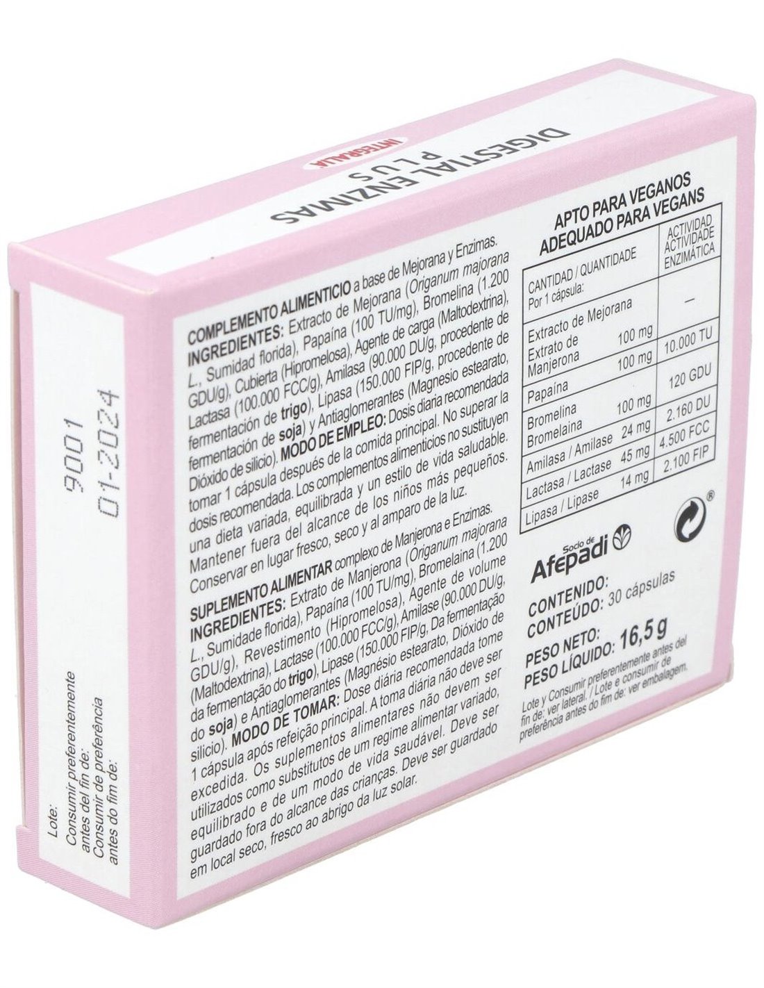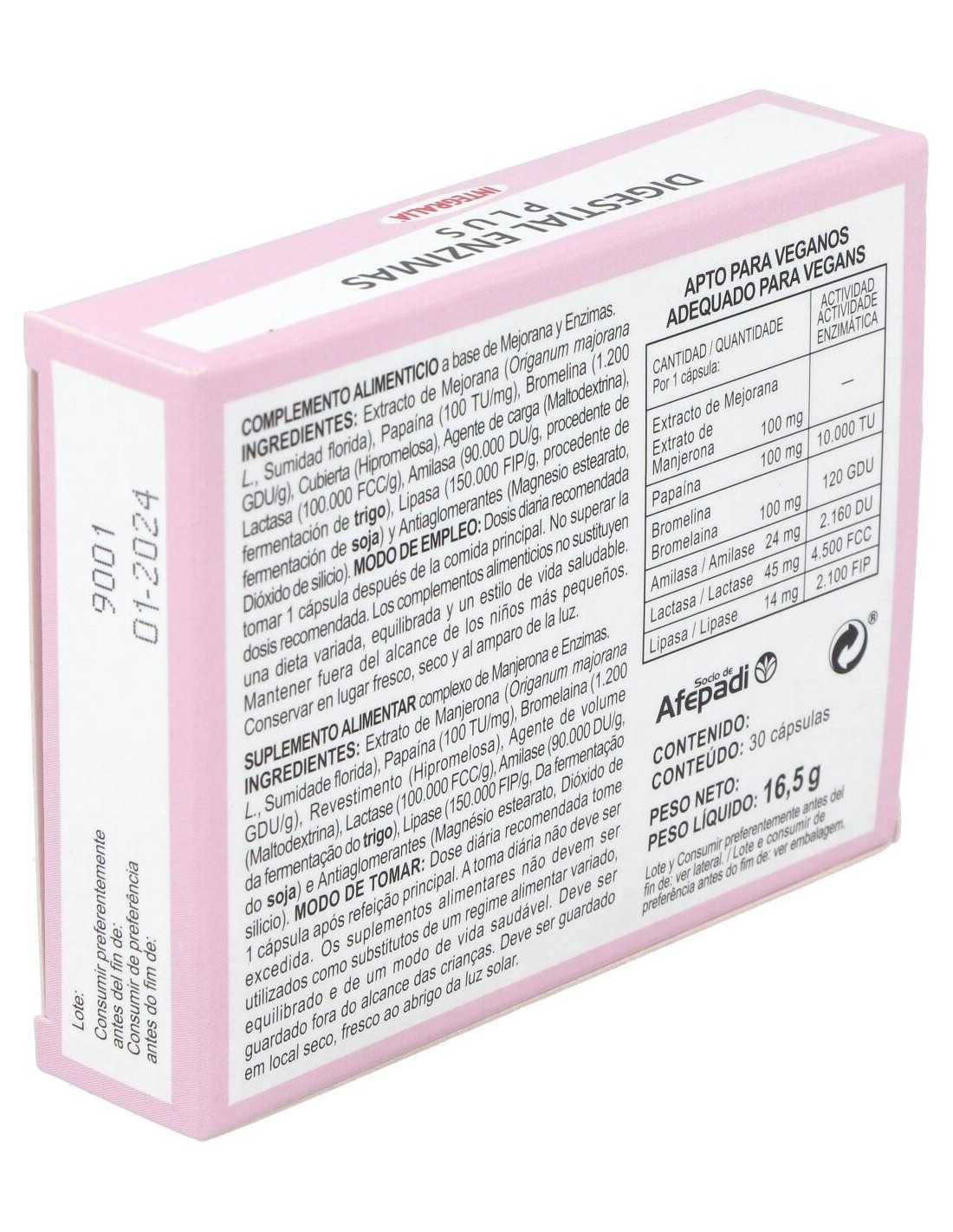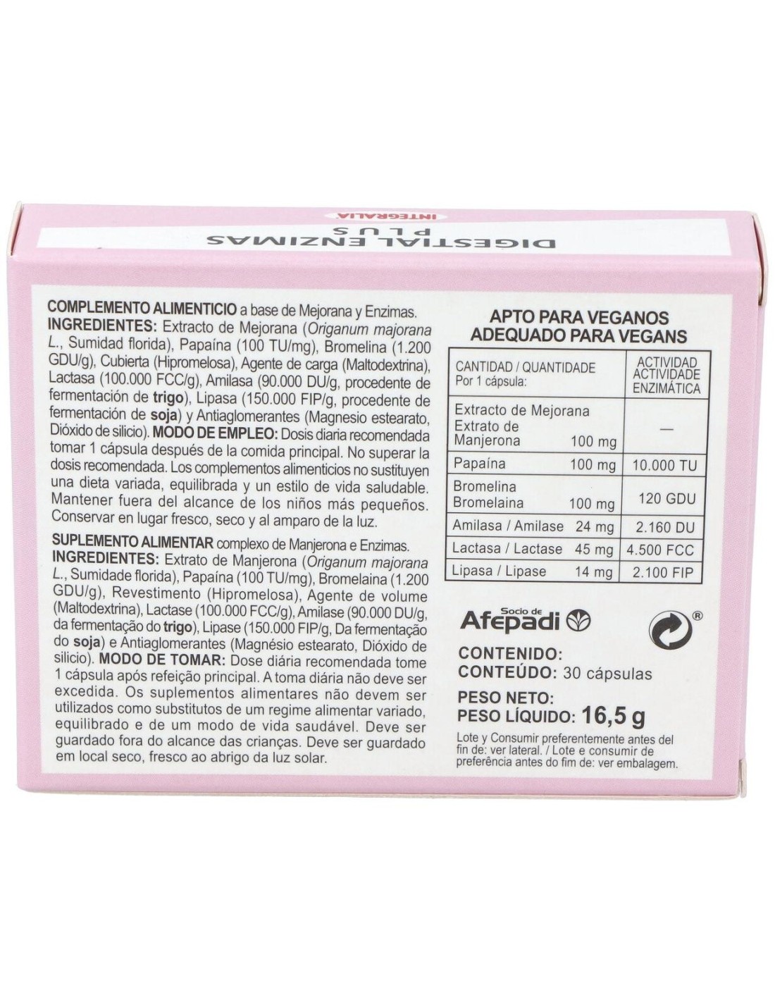 Extracto de Mejorana (Origanum majorana L., Sumidad florida) 100 mg ,Papaína 100 mg actividad enzimática 10.000 TU, Bromelina 100 mg actividad enzimática 120 GDU, Amilasa 24 mg (procedente de fermentación de trigo) actividad enzimática 2.160 DU, Lactasa 45 mg actividad enzimática 4.500 FCC,y Lipasa 14 mg (procedente fermentación de soja) actividad enzimática 2.100 FIP.