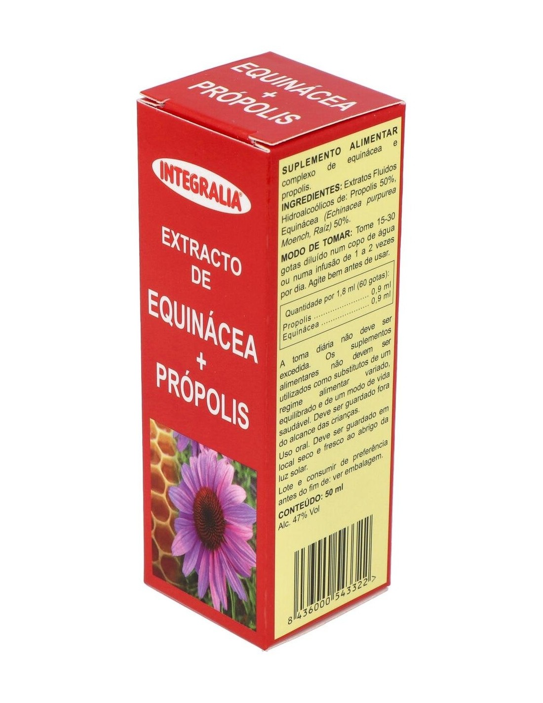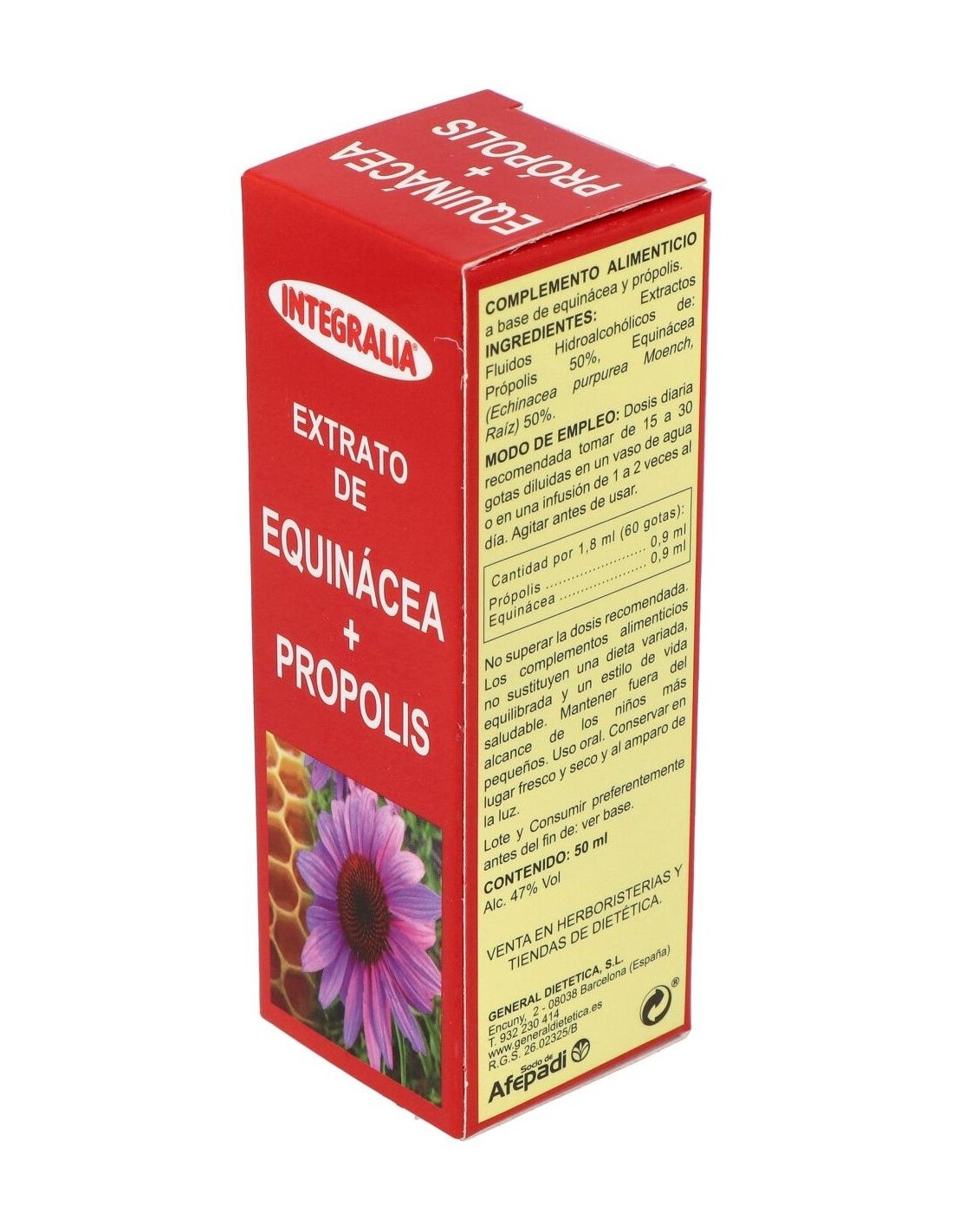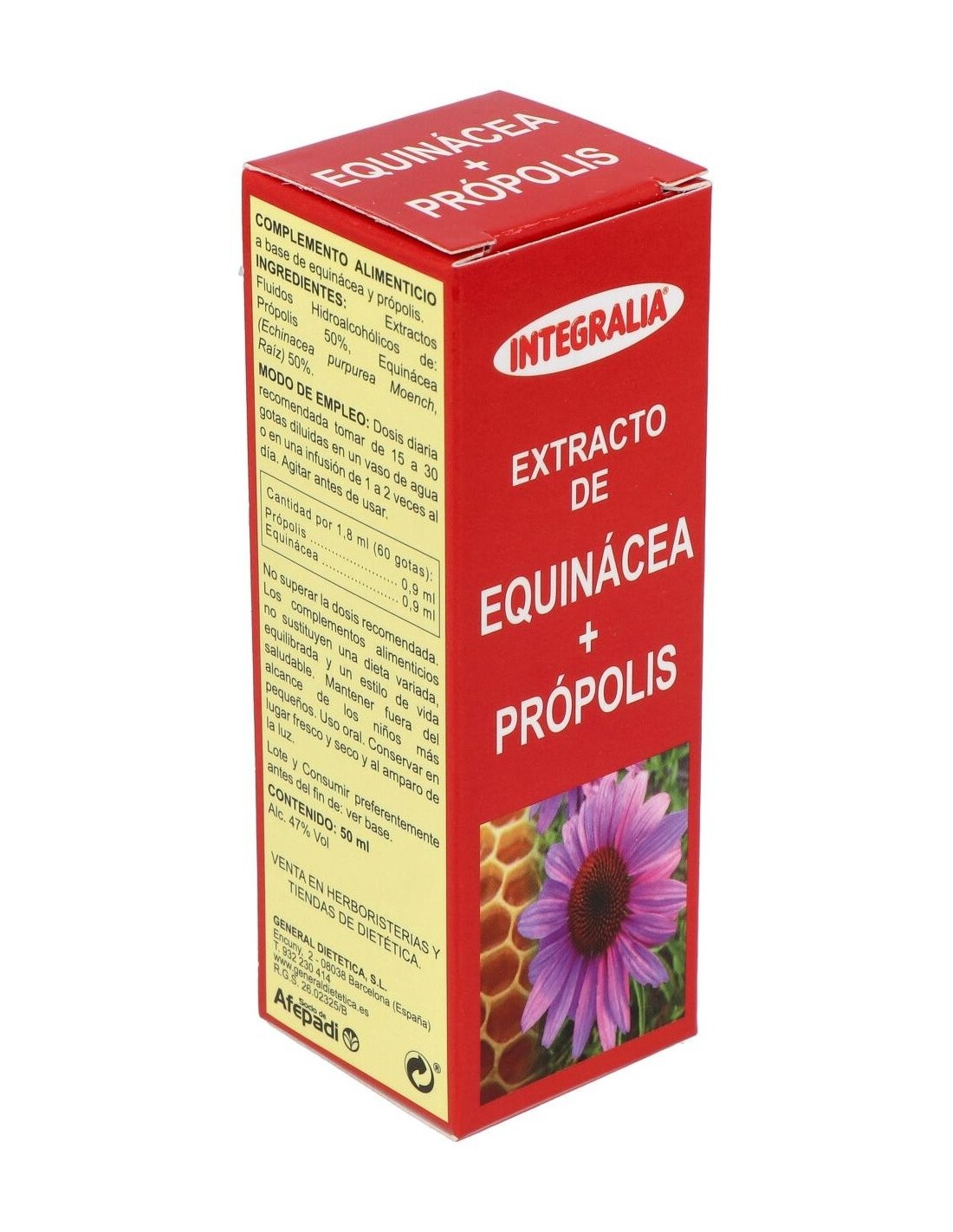 Ingredientes:Equinácea (Equinacea purpurea Moench, Raiz) 0,9 ml, Própolis 0,9 ml de ext. fluido.Modo de empleo:Tomar de 15 a 30 gotas 1 o 2 veces al día. Se puede tomar diluido en un vaso de agua o en una infusión.Presentación:Envase de 50 ml.