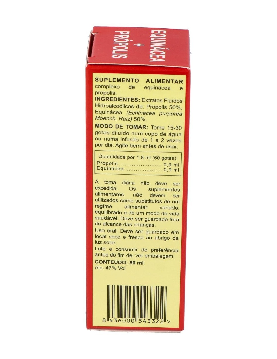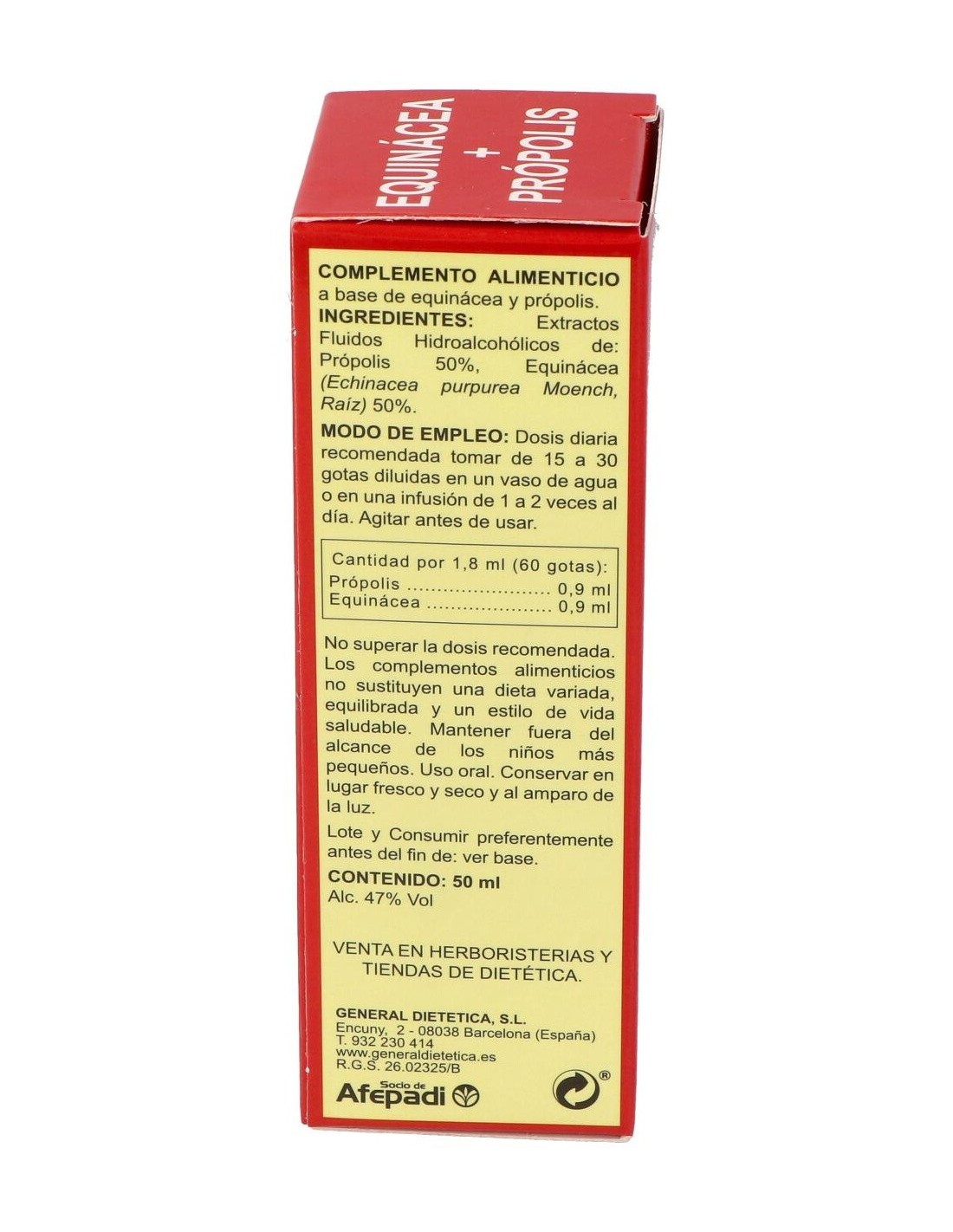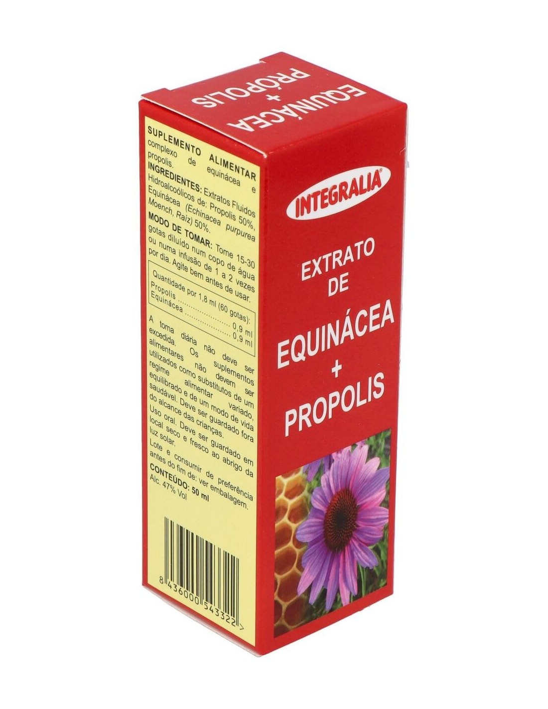 Ingredientes:Equinácea (Equinacea purpurea Moench, Raiz) 0,9 ml, Própolis 0,9 ml de ext. fluido.Modo de empleo:Tomar de 15 a 30 gotas 1 o 2 veces al día. Se puede tomar diluido en un vaso de agua o en una infusión.Presentación:Envase de 50 ml.