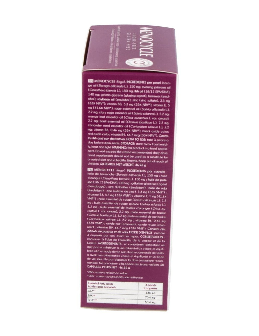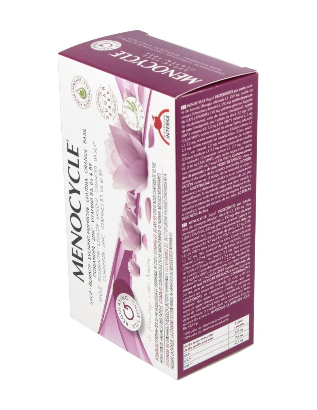 Ingredientes:aceite de borraja (Borago officinalis L.)(150 mg), aceite de onagra (Oenothera biennis L.)(150 mg), aceite de pescado (18/12 EPA/DHA)(140 mg), gelatina-glicerina (agente de recubrimiento); cera de abejas (emulgente); aceite de soja (emulgente); zinc (sulfato de zinc)(3,3 mg), vitamina B3,(5,3 mg), vitamina E (5 mg), aceite esencial de salvia (Salvia officinalis L.)(2,2 mg), aceite esencial de amaro (Salvia sclarea L.)(2,2 mg), aceite esencial de naranjo-hojas (Citrus aurantium L. var. amara)(2,2 mg), aceite esencial de basílico (Ocimum basilicum L.)(2,2 mg), aceite esencial de semillas de coriandro (Coriandrum sativum L.)(2,2 mg), vitamina B6 (0,46 mg), color óxido negro; color óxido rojo; vitamina B9 (66,7 mcg).Modo de empleo:Tomar 3 perlas al día, una antes de cada comida.Presentación:Envase de 60 perlas.Recomendaciones y advertencias:Apto para veganos. No contiene azúcares ni gluten. Contiene derivados de pescado y de soja.