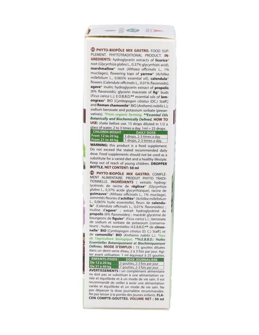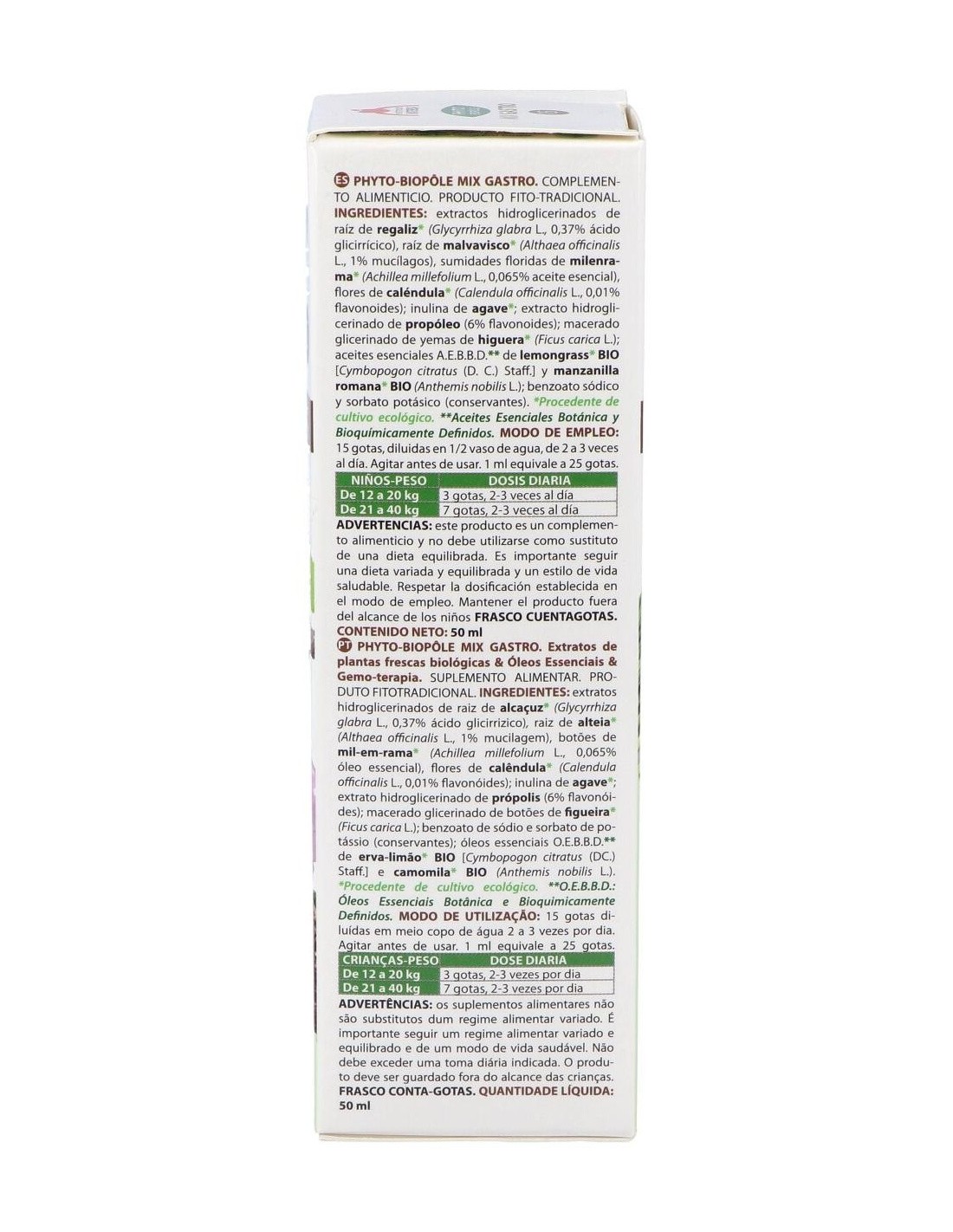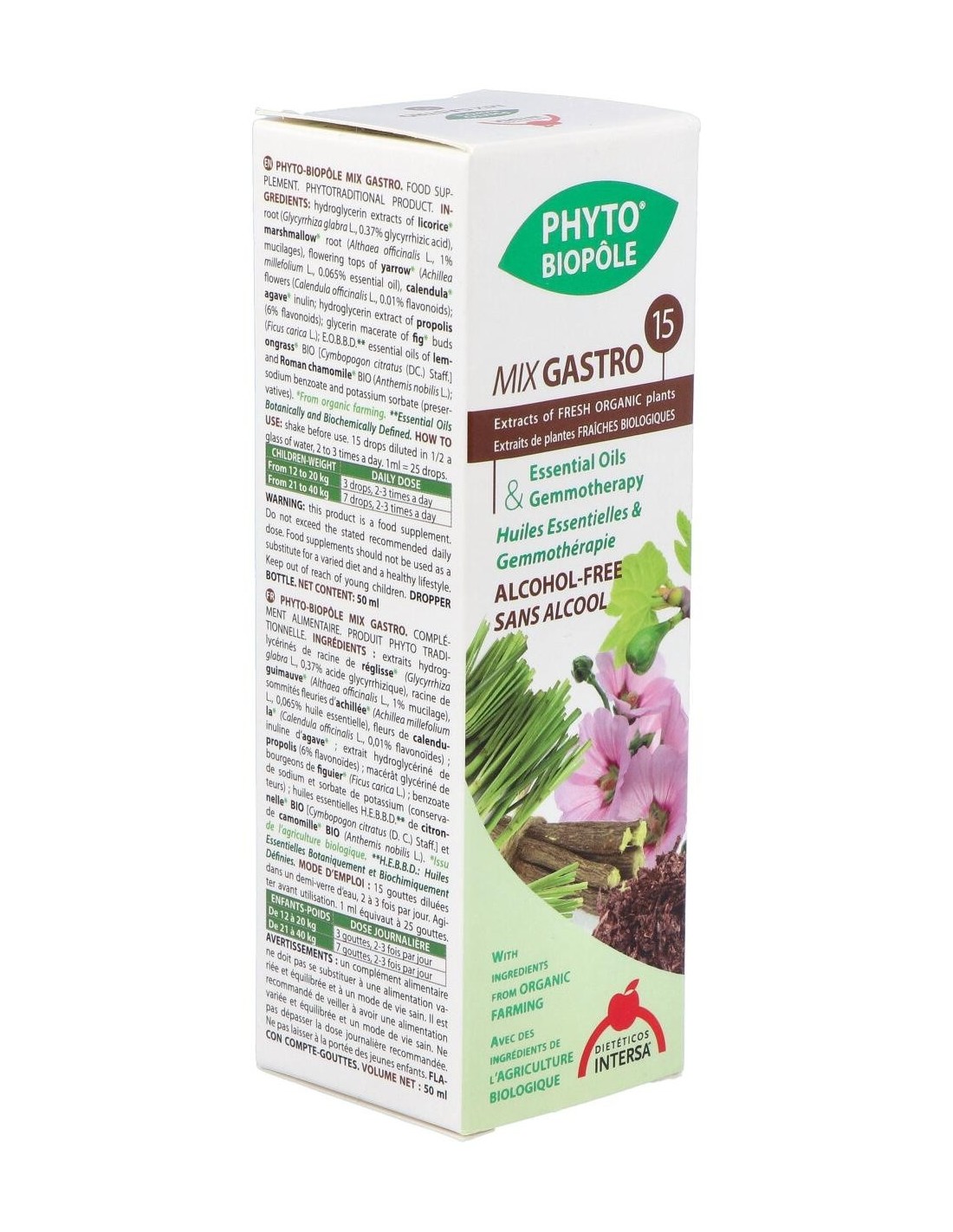 Mix Gastro es un producto natural perteneciente a la linea Phyto Biopole, que aporta una excelente combinación de extractos combinados de plantas, yemas y aceites esenciales útiles en los procesos digestivos, disgestiones lentas y pesadas. Ingredientes:Extractos hidroglicerolinados de: raíz de regaliz* (Glycyrrhiza glabra L., 0,37% ácido glicirrícico), raíz de malvavisco* (Althaea officinalis L., 1% mucílagos), sumidades floridas de milenrama* (Aquillea millefolium L., 0,065% aceite esencial) y flores de caléndula* (Calendula officinalis L., 0,01% flavonoides). Inulina de ágave*. Extracto hidroglicerolinado de propóleo (6% flavonoides). Macerado glicerinado de yemas de higuera* (Ficus carica L.). Aceites esenciales A.E.B.B.D.** de: lemongrass* BIO (Cymbopogon citratus DC Staff) y manzanilla romana* BIO (Anthemis nobilis L.). Benzoato sódico. Sorbato potásico (conservantes). (*) Procedente de cultivo ecológico. (**) Aceites esenciales botánica y bioquímicamente definidos. Modo de empleo:Tomar 15 gotas, diluidas en 1/2 vaso de agua, de 2 a 4 veces al día. Presentación:Frasco cuentagotas de 50 ml.Recomendaciones y advertencias:Apto para veganos. No contiene gluten, propilenglicol ni alcohol etílico.