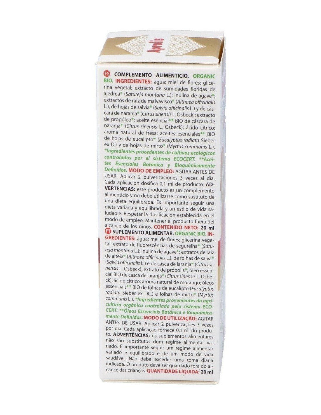 Spray bucal formulado a base de propóleo, salvia y malvavisco. Contiene aceites esenciales de naranjo y eucalipto. Favorece la sensación de alivio y confort en la garganta. Es usado en afecciones leves de la garganta producida por el catarro o resfriado común. Indicado para niños.