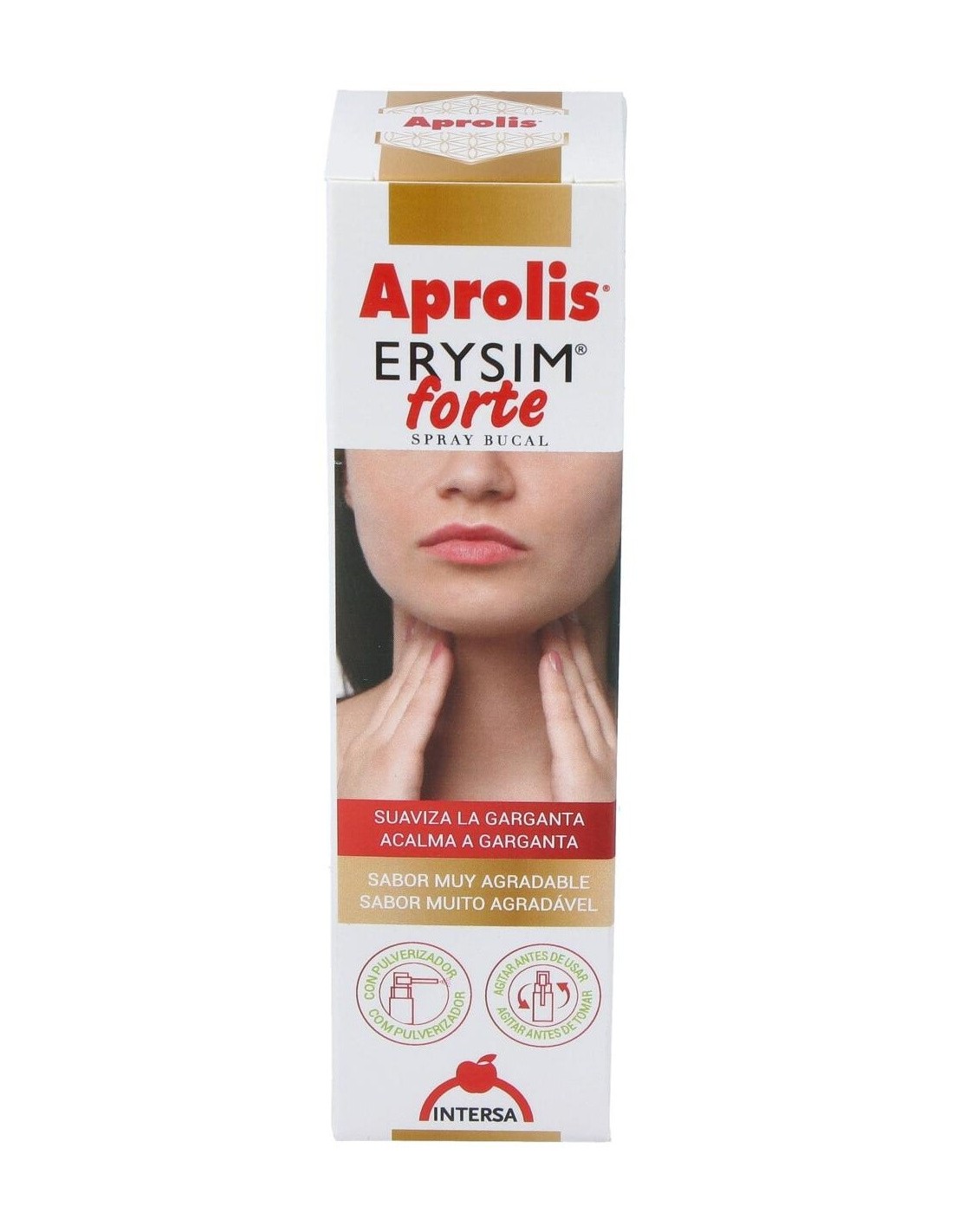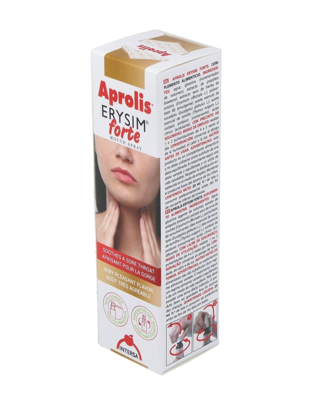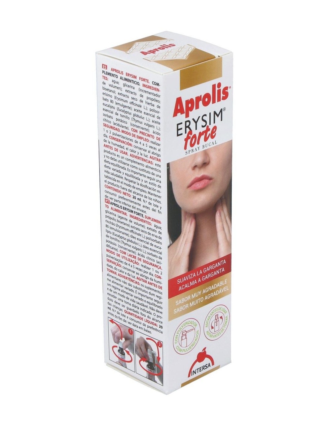 Aprolis Erysim Forte asocia las propiedades antiinflamatorias y antisépticas del propóleo, a las propiedades del erísimo o hierba de los cantores que por su contenido en mucílagos permite formar una película en la cavidad faríngea que suaviza y elimina la irritación de la garganta así como la afonía y la tos. Por otro lado los aceites esenciales que contiene le confieren una acción balsámica y antiinfecciosa de acción local. Usado para afonía, tos, bronquitis, asma, faringitis agudas y crónicas, expectoraciones, resfriados, personas que en su trabajo tienen que forzar su voz. Ingredientes:Glicerina (incrementador de volumen); agua; extracto de propóleo (8,6%); bioetanol; extracto seco de hierba de erísimo (Erysimum offcinale L.)(10%); Solubol NV (emulgente); aceites esenciales de eucalipto (Eucalyptus globulus L.) - 0,5% y tomillo (Thymus vulga-ris L.)(0,2); sorbato potásico (conservante).Modo de empleo:Realizar 1 ó 2 pulverizaciones, de 4 a 5 veces al día. Presentación:Envase de 20 ml con pulverizador.Recomendaciones y advertencias:No contiene gluten, azúcares añadidos ni alcohol. No OGM. Contiene soja.