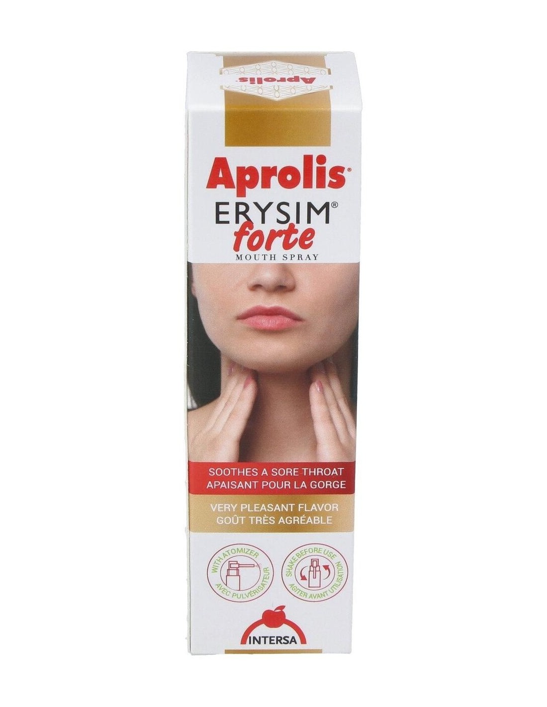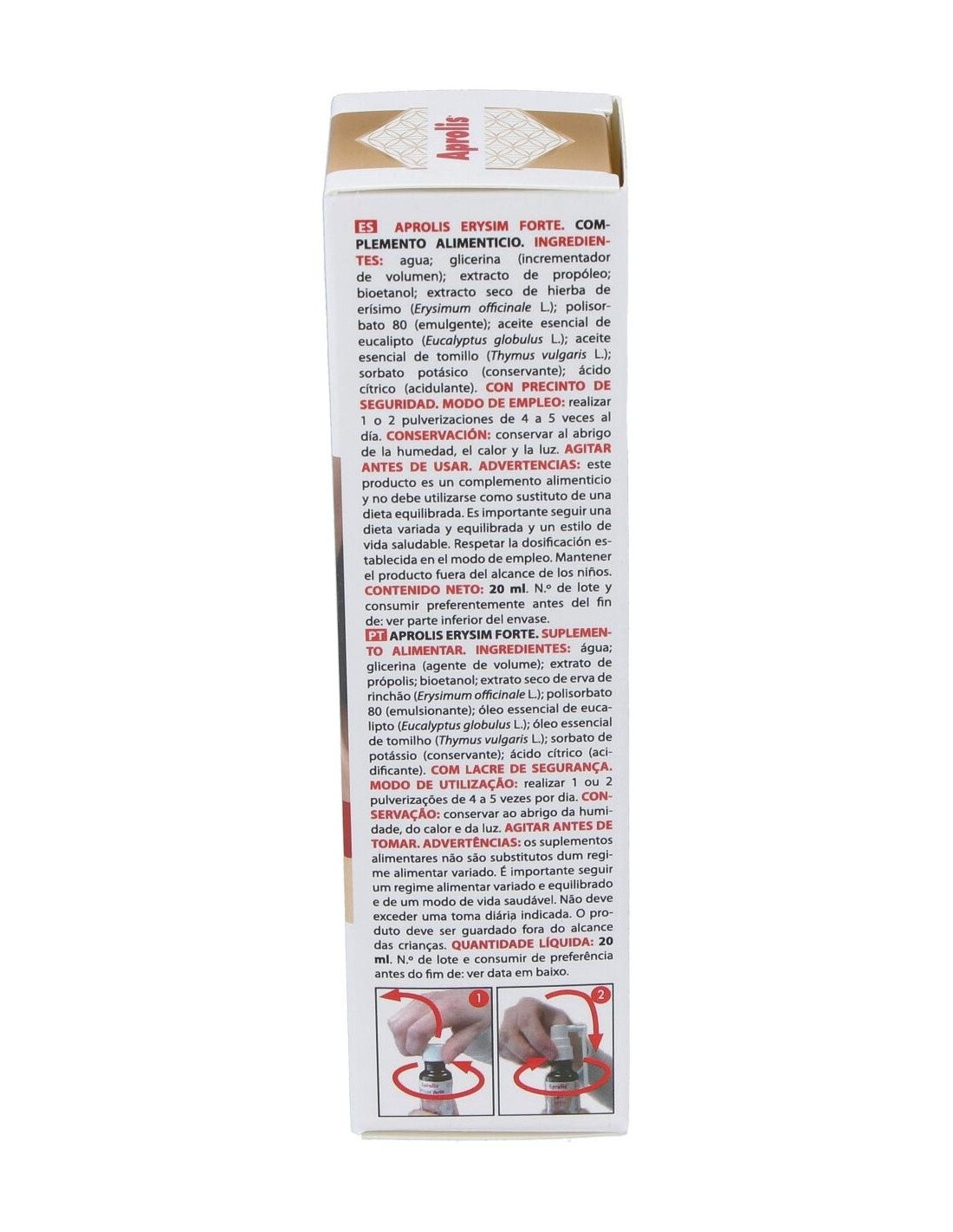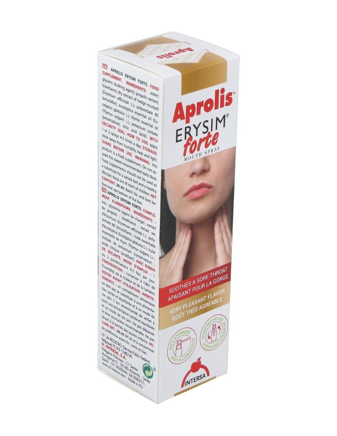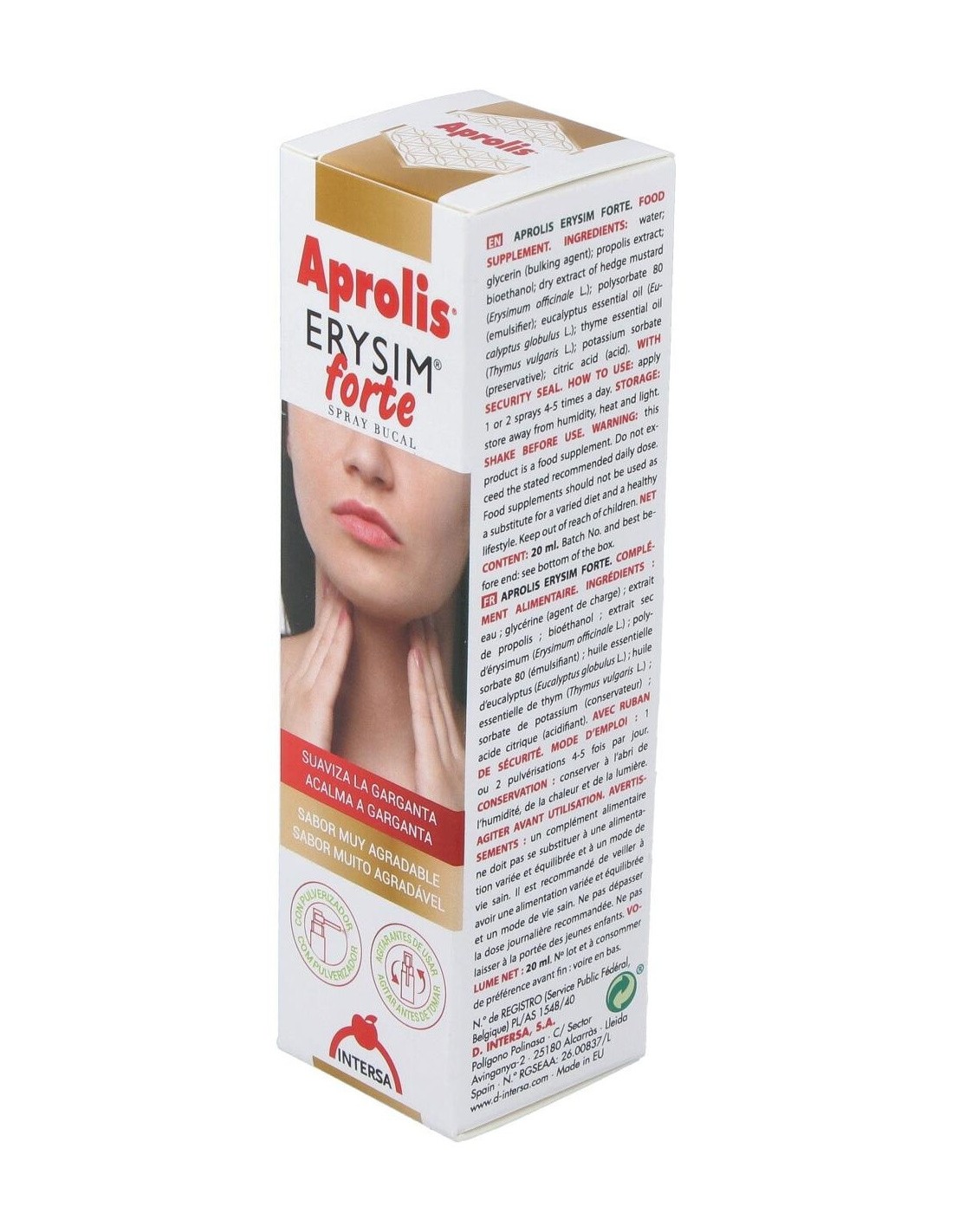 Aprolis Erysim Forte asocia las propiedades antiinflamatorias y antisépticas del propóleo, a las propiedades del erísimo o hierba de los cantores que por su contenido en mucílagos permite formar una película en la cavidad faríngea que suaviza y elimina la irritación de la garganta así como la afonía y la tos. Por otro lado los aceites esenciales que contiene le confieren una acción balsámica y antiinfecciosa de acción local. Usado para afonía, tos, bronquitis, asma, faringitis agudas y crónicas, expectoraciones, resfriados, personas que en su trabajo tienen que forzar su voz. Ingredientes:Glicerina (incrementador de volumen); agua; extracto de propóleo (8,6%); bioetanol; extracto seco de hierba de erísimo (Erysimum offcinale L.)(10%); Solubol NV (emulgente); aceites esenciales de eucalipto (Eucalyptus globulus L.) - 0,5% y tomillo (Thymus vulga-ris L.)(0,2); sorbato potásico (conservante).Modo de empleo:Realizar 1 ó 2 pulverizaciones, de 4 a 5 veces al día. Presentación:Envase de 20 ml con pulverizador.Recomendaciones y advertencias:No contiene gluten, azúcares añadidos ni alcohol. No OGM. Contiene soja.