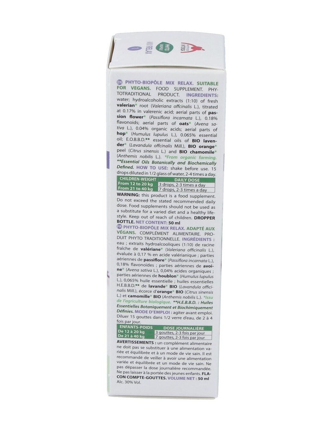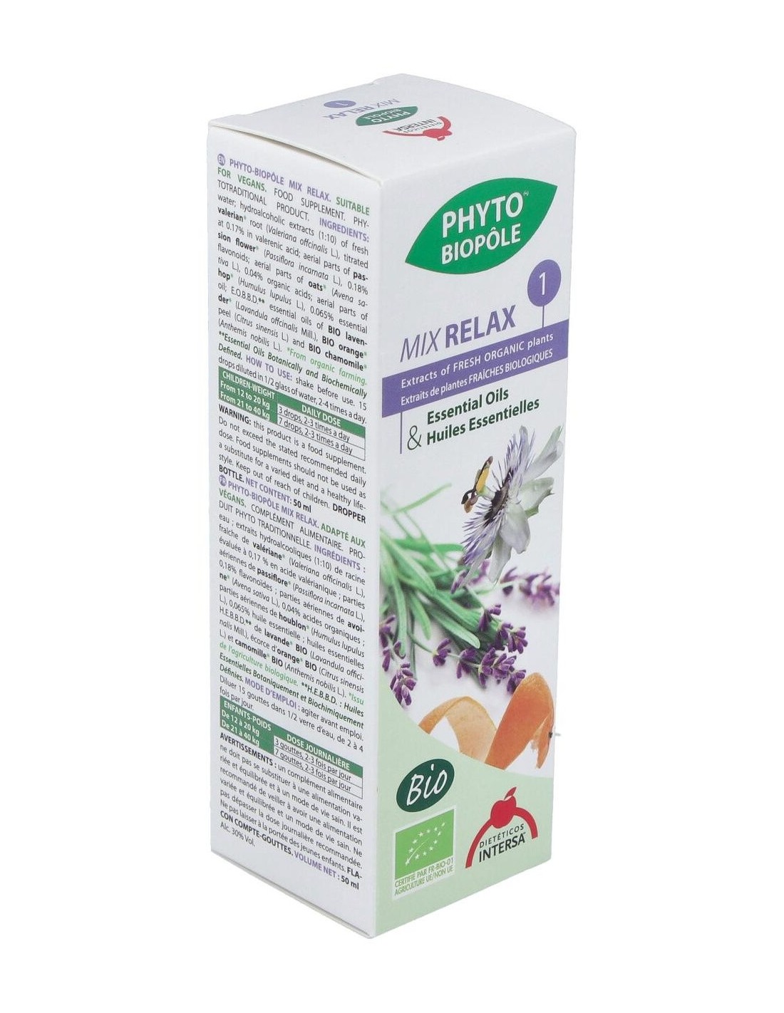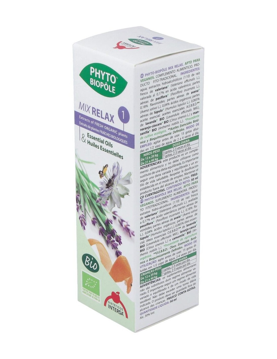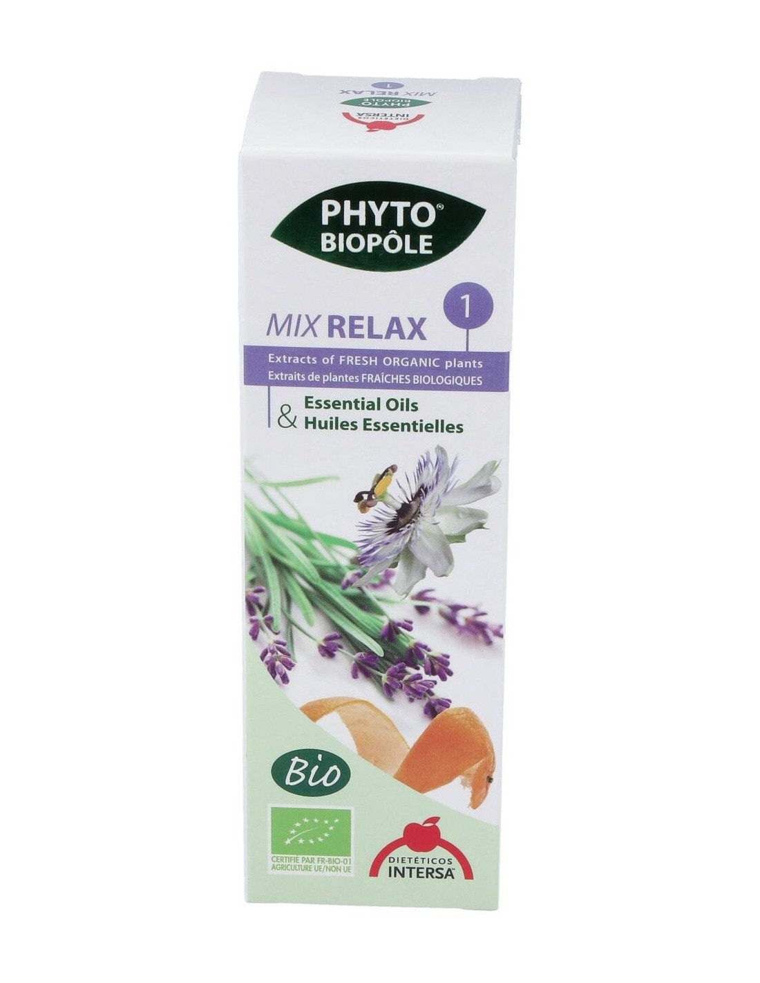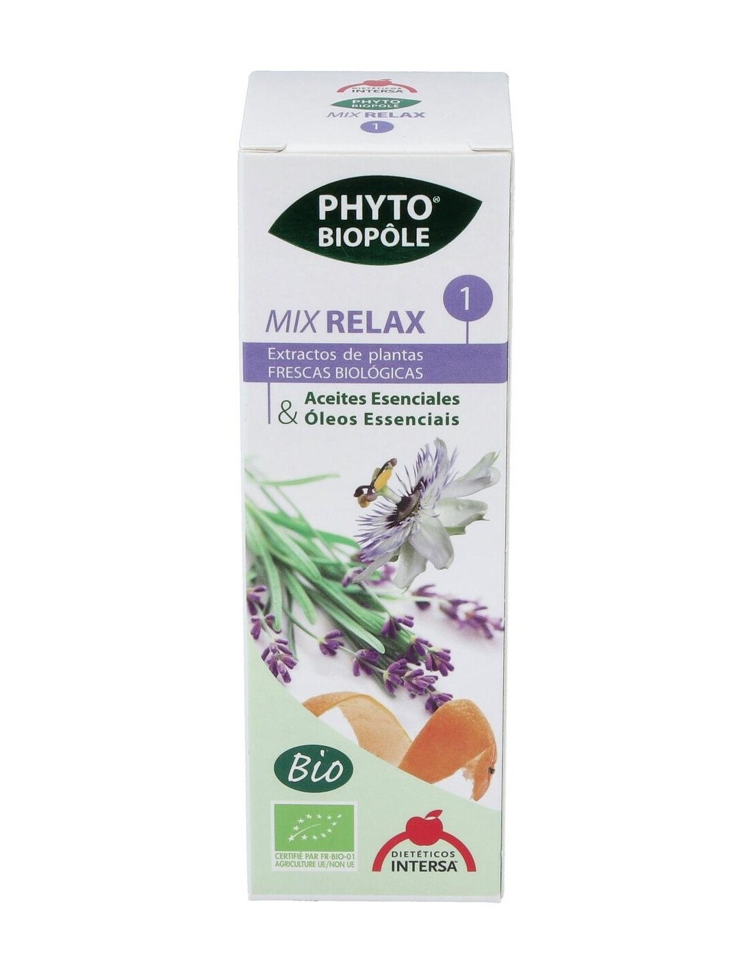 Mix Relax es un suplemento natural integrado en la linea Phyto Biopole, linea de extractos combinados de plantas y yemas mezclados con los aceites esenciales, dando como resultado un productos altamente eficaz conservando todo el jugo fresco de la planta, fruto o raiz unido a la acción de los más preciados aceites esenciales. Mix Relax está indicado como producto relajante ayudando al bienestar, combate el nerviosismo y la ansiedad. Ingredientes:Agua; extractos hidroalcohólicos (1:10) de raíz fresca de valeriana* (Valeriana officinalis L.),