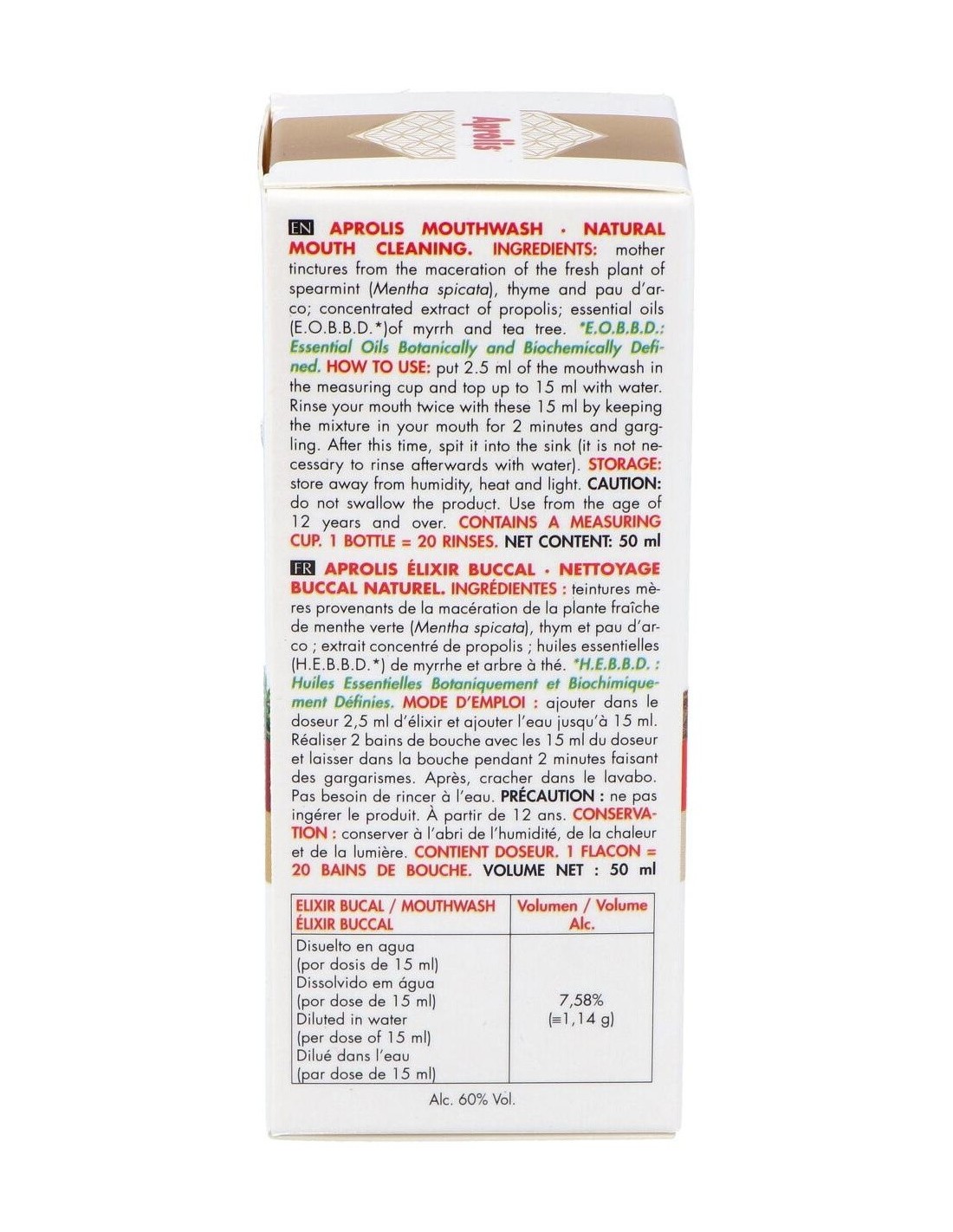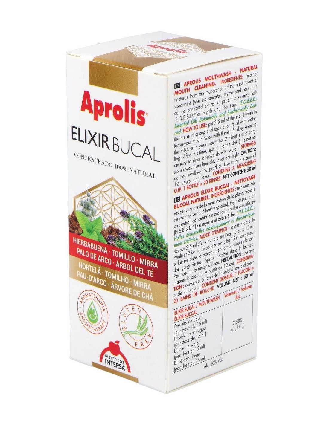 Ingredientes (INCI):Mentha Viridis (Spearmint) Extract, Thymus Vulgaris (Thyme) Extract, Lavandula Angustifolia (Lavender) Extract, Tabebuia Impetiginosa Extract, Propolis Extract, Commiphora Myrrha Oil, Melateuca Alternifolia (Tea Tree) Oil.Modo de empleo:Añadir al dosificador la cantidad de 2,5 ml de elixir, continuar añadiendo agua hasta los 15 ml. Dejar en la boca la mezcla durante 2 minutos, gargareando por toda la zona bucal. Pasado este tiempo, eliminar en lavabo. No es necesario enjuagar a posteriori con agua. Precaución: no ingerir el producto. Realizar 2 enjuagues de los 15 ml del dosificador. Presentación:Frasco de 50 ml con dosificador.Recomendación y advertencias:No contiene: Gluten ni azúcares.