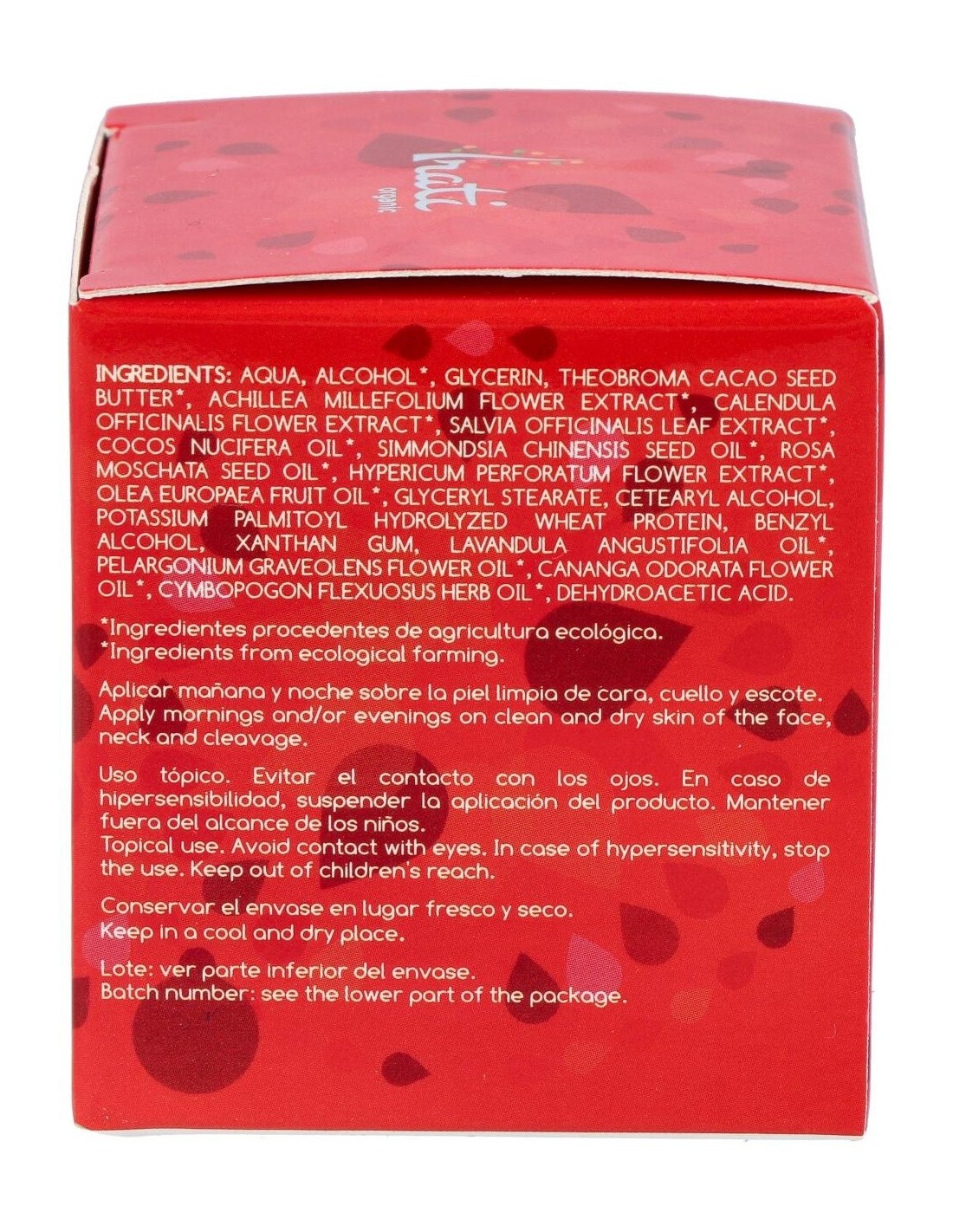 Esta crema está elaborada con ingredientes certificados de origen biológico, priorizando la calidad y el respeto por el medio ambiente. Su composición está diseñada para integrarse en rutinas de cuidado facial que buscan mantener la hidratación natural y el equilibrio cutáneo.
