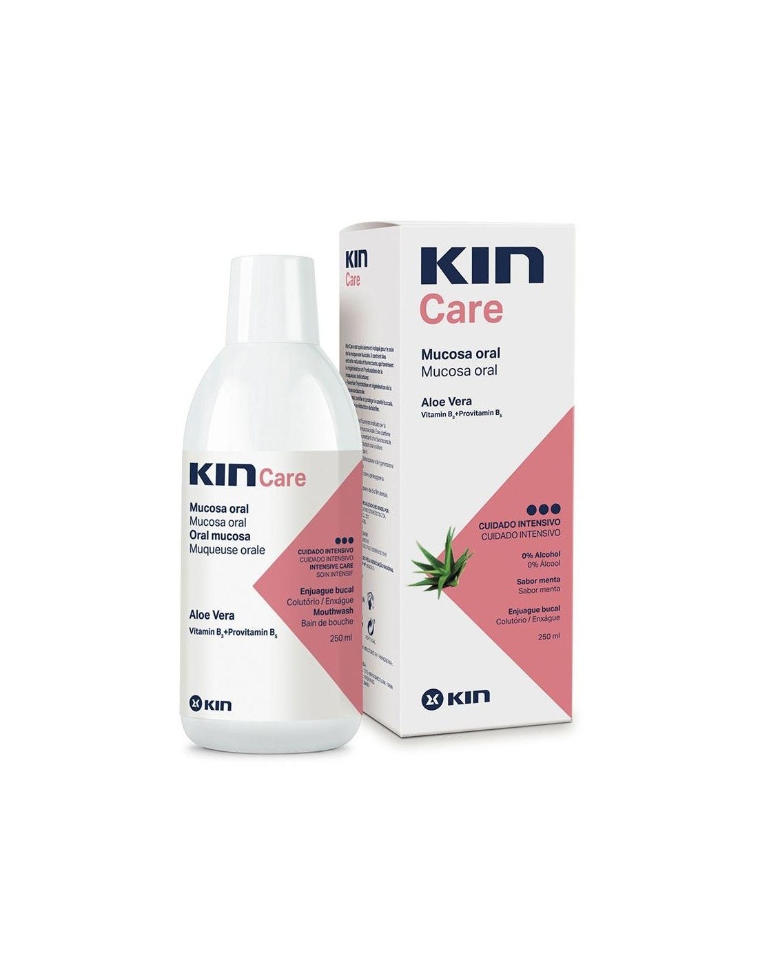 KINIncorpora en su composición aloe vera, provitamina B5, vitamina B3 y betaína, que refuerzan, hidratan y fortalecen la mucosa oral afectada. Reduce la placa dental. Sabor a menta.