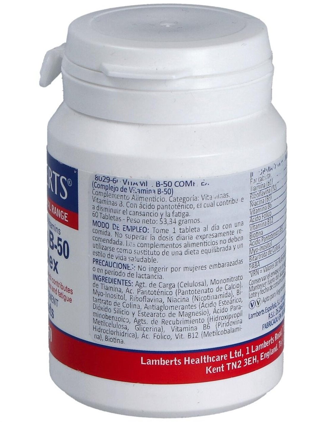 LAMBERTSEl Complejo de Vitaminas B-50 60 Tabs. de Lamberts es un suplemento para adultos que contribuye al metabolismo energético y al funcionamiento normal del sistema nervioso, gracias a su combinación equilibrada de vitaminas del grupo B.