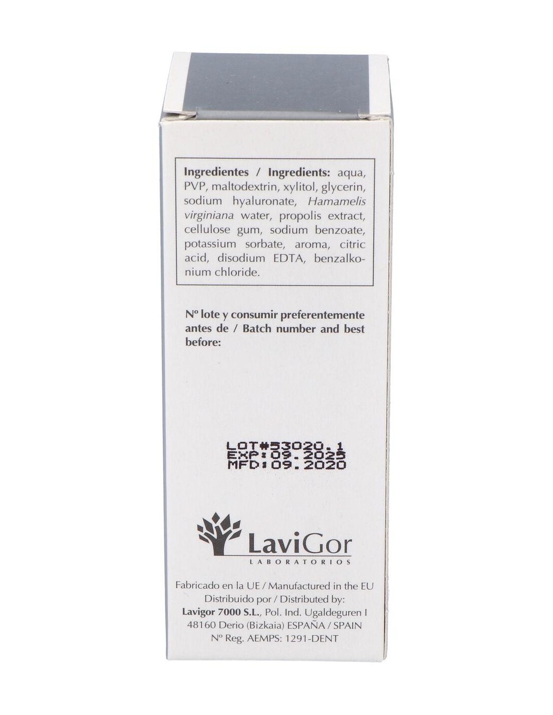 Aqua, PVP, maltodextrin, xylitol, glycerin, sodium hyaluronate, Hamamelis virginiana water, propolis extract, cellulose gum, sodium benzoate, potassium sorbate, aroma, citric acid, disodium EDTA, benzalkonium chloride.