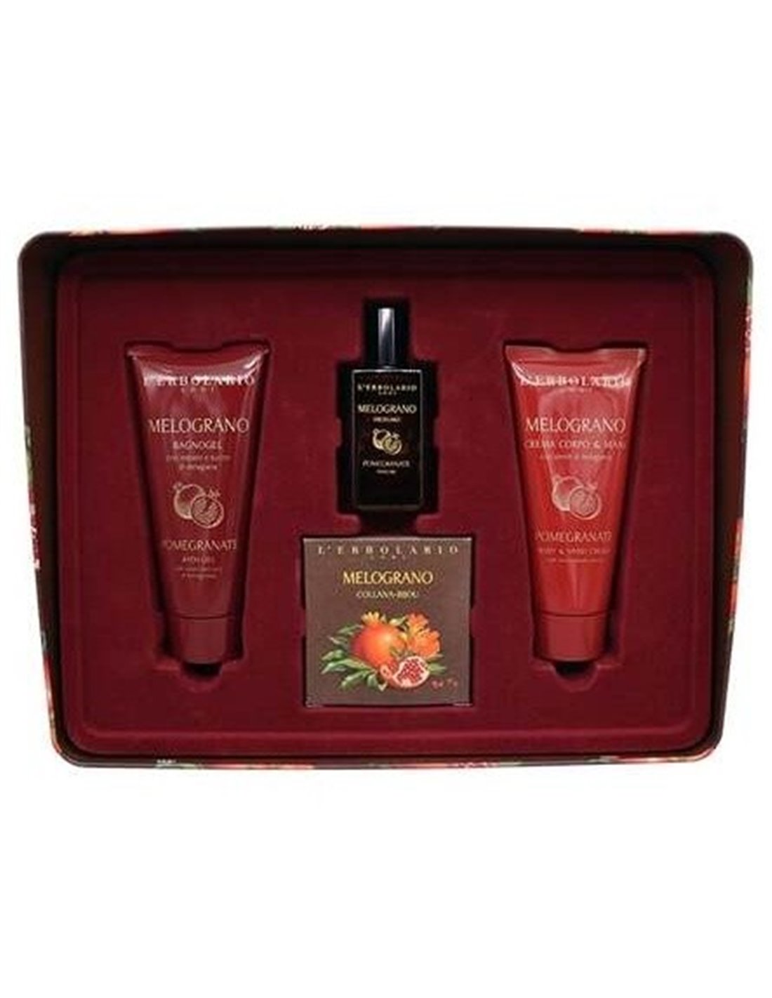 L´ERBOLARIOCaja metálica reutilizable para regalo con efecto sorpresa que contiene:\ - Perfume Granada 50 ml\ - Gel de Baño Granada 100 ml\ - Crema Corporal y Manos Granada 100 ml \ - Collar-joya