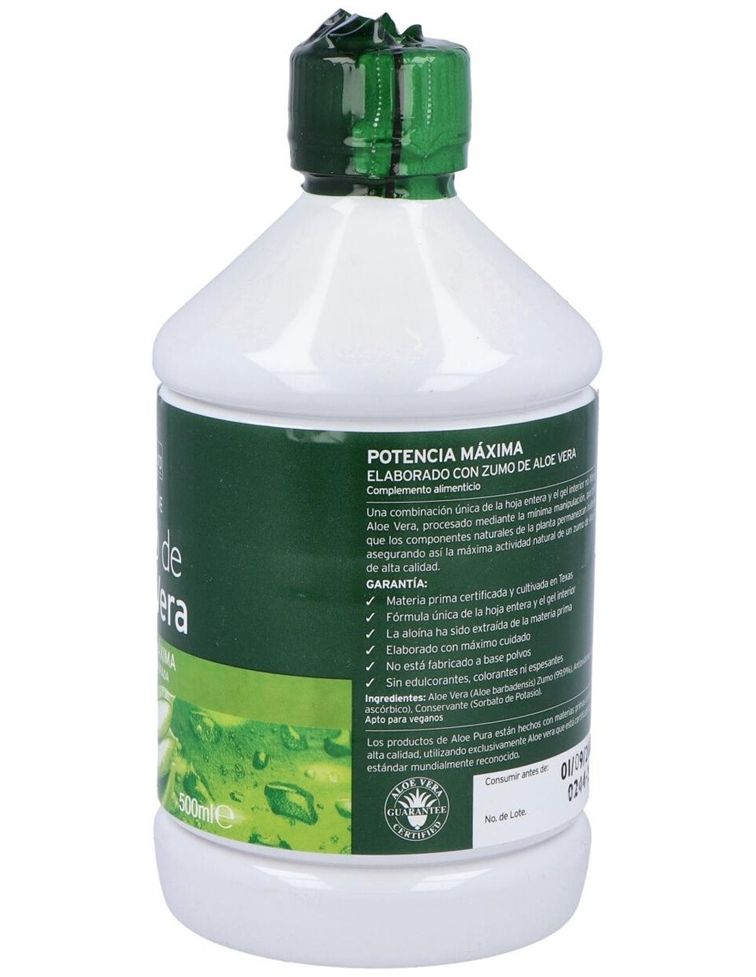 Aloe Vera (Aloebarbadensis) Jugo de hoja de concentrado, Aloe Vera (Aloebarbadensis) Jugo de hoja interna, Antioxidante (Ácido ascórbico), Conservante (Sorbato de potasio).