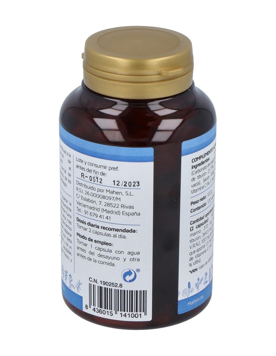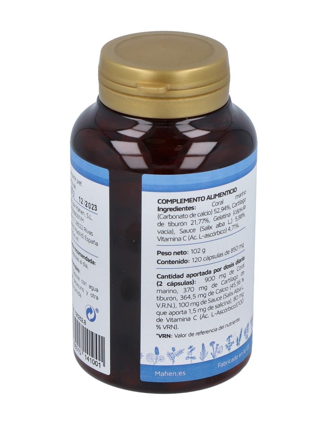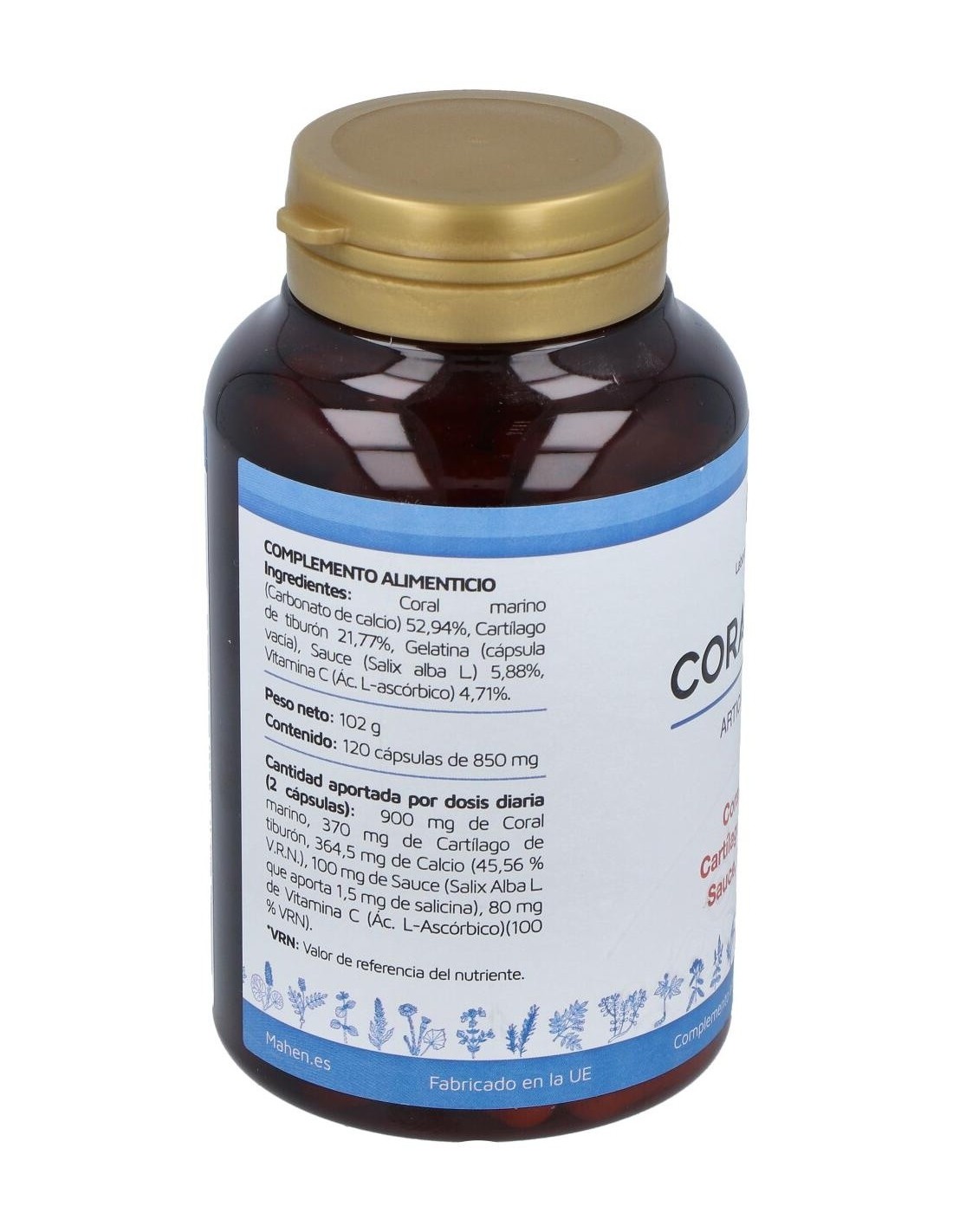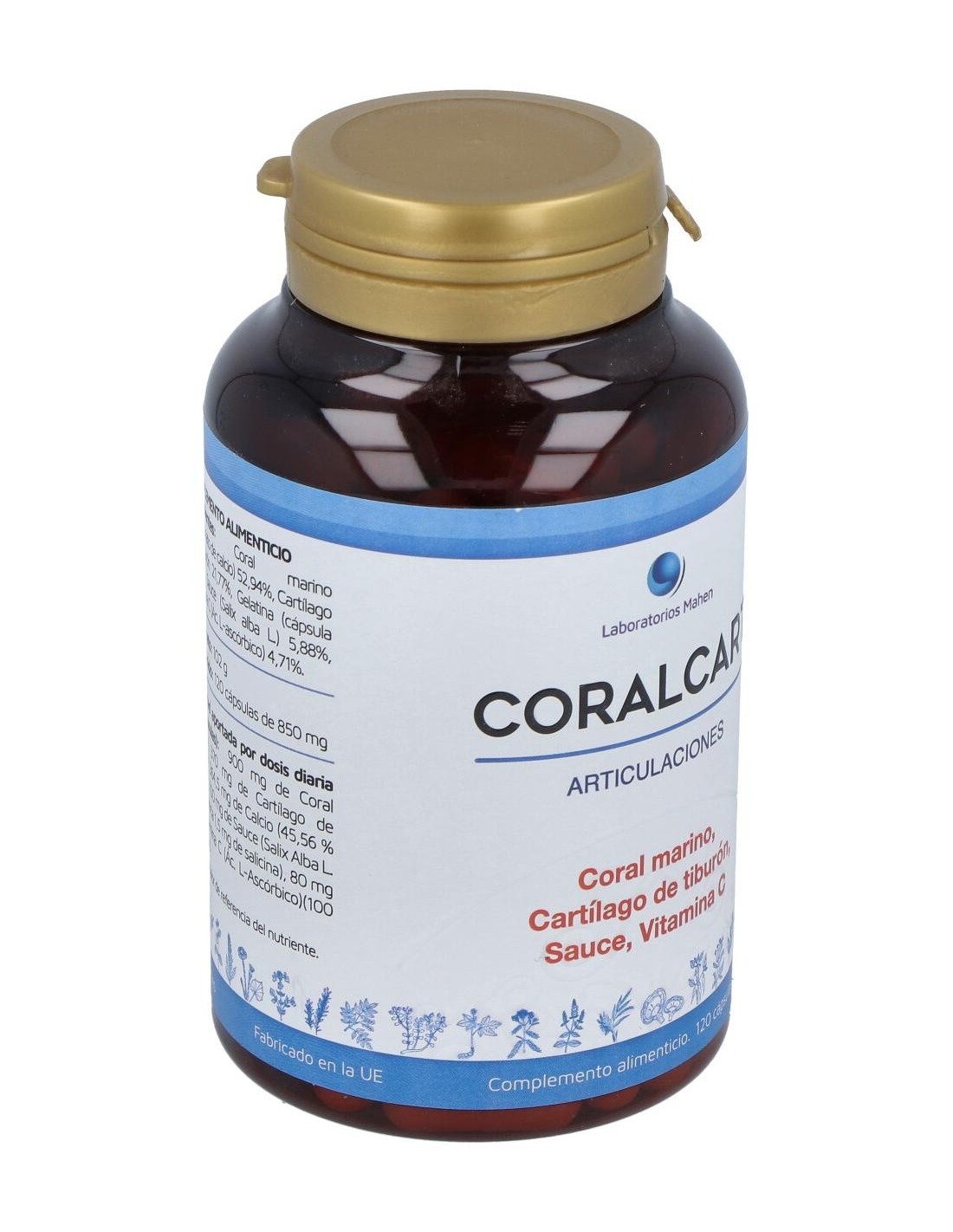 Ingredientes CoralcartCoral shango (carbonato de calcio) 52,94%, cartílago de tiburón 21,77%, gelatina (cápsula vacía), sauce (Salix alba L.) 5,88%, vitamina C (ácido l-ascórbico) 4,71%. Cómo Tomar Coralcart MahenSe recomienda tomar 2 cápsulas al día de este suplemento nutricional para lograr los mejores resultados. Recuerda siempre consultar con tu médico antes de empezar cualquier tratamiento, aunque sea de origen natural. Coralcart 120 de MahenEn este apartado te traemos el bote de Coralcart de 120 cápsulas, pero en Salud Natural también te traemos la versión de Mahen de Coralcart 60 cápsulas. ¡Escoge la que mejor se adapte a ti y a tus necesidades!Coralcart ContraindicacionesCoralcart puede tener efectos secundarios en personas alérgicas al marisco, embarazadas, niños y diabéticos, para el resto, siempre que mantengamos la ingesta diaria recomendada, no tienen porqué darse ningún tipo de efectos adversos. Aunque queremos destacar que, en caso de producirse, algunos de estos efectos podrían ser: