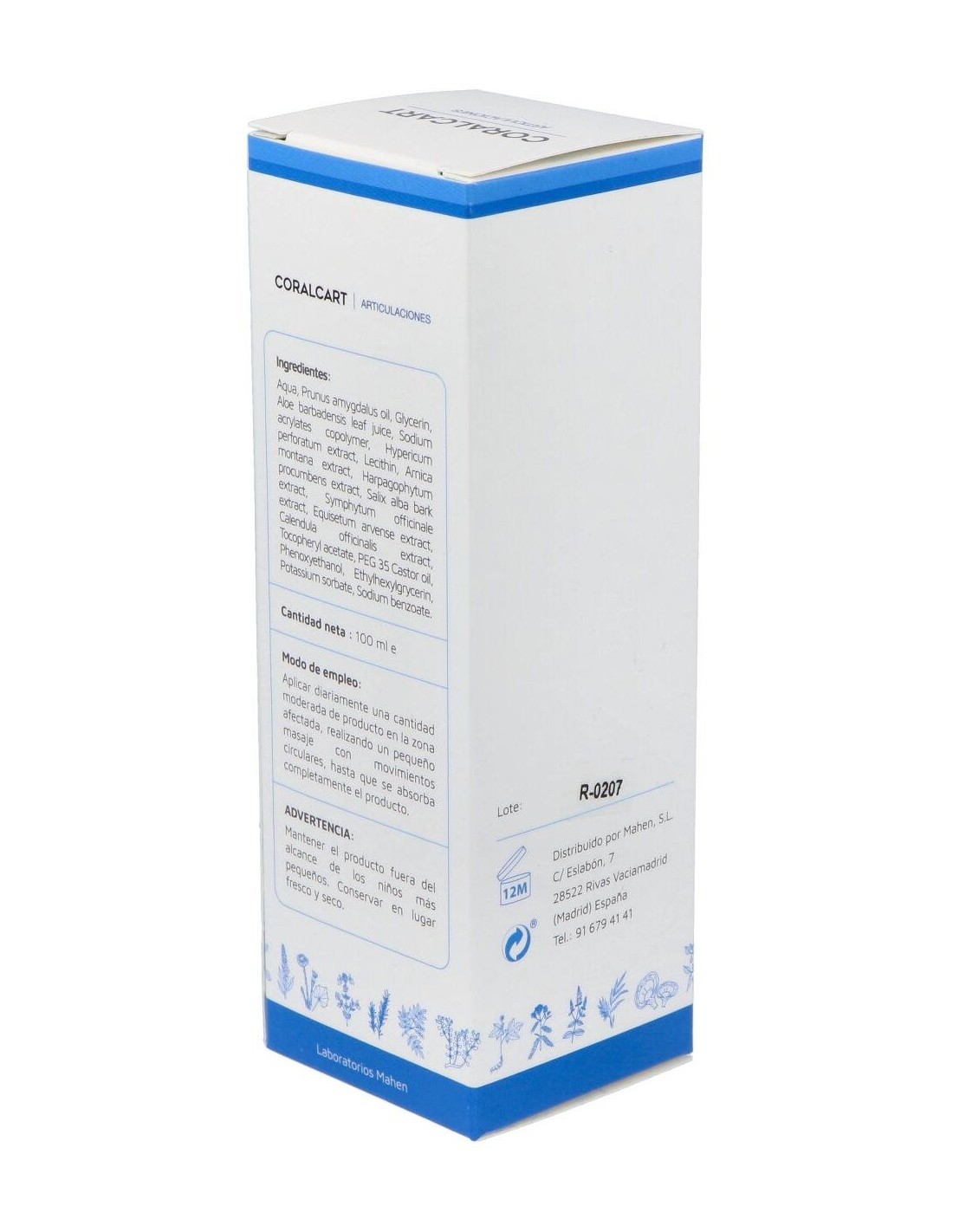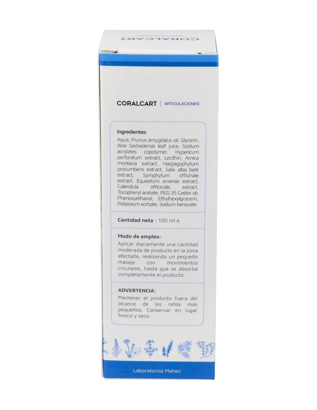Composición:Agua, aceite de almendras dulces, glicerina, aloe vera, copolímero de acrilatos de sodio, extracto de hipérico, lecitina, extracto de árnica montana, extracto de harpagofito, extracto de corteza de sauce blanco, extracto de consuelda, extracto de cola de caballo, extracto de caléndula, acetato de tocoferol, aceite de ricino, fenoxietanol, etilhexilglicerina, sorbato de potasio, benzoato de sodio.Modo de empleo:Tres aplicaciones diarias en la zona afectada mediante un suave masaje hasta que la crema se absorba por completo. Uso tópico exclusivo.Presentación:Tubo de 100 ml.