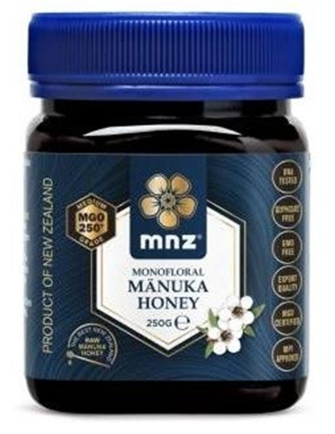 La miel de manuka es una miel densa y de color ámbar oscuro. Es la miel que producen las abejas a partir del néctar de la flor de manuka, original de Nueva Zelanda. Muy rica en micronutrientes y sustancias oxidantes como los polifenoles. Contiene una sustancia llamada metilglioxal, también conocida por sus siglas MGO, a la que se le atribuye una propiedad antimicrobiana muy destacable.