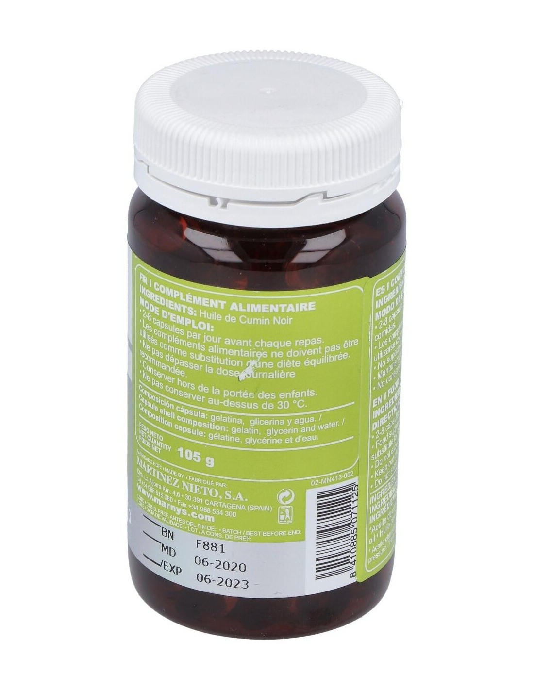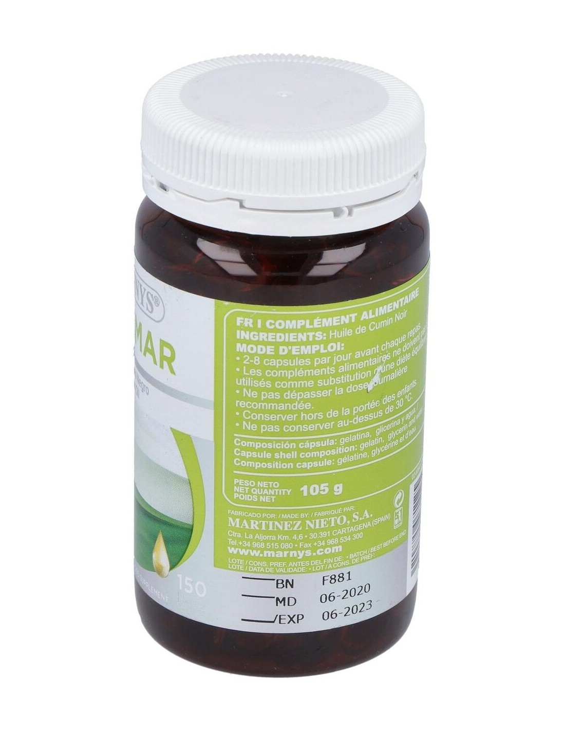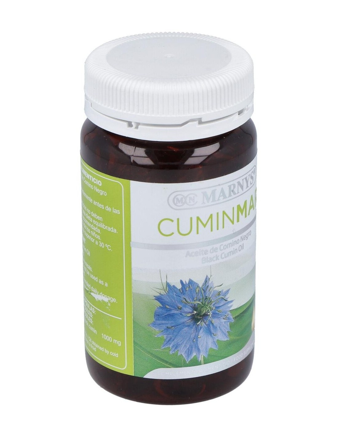 MARNYSCápsulas blandas de aceite de Comino Negro obtenido por prensado en frío, que mantiene su contenido natural de Omega 6 y timoquinona. La Timoquinona es un componente volátil del Comino Negro, del grupo de las benzoquinonas, que ha demostrado efectos antioxidantes y otras interesantes bioactividades.