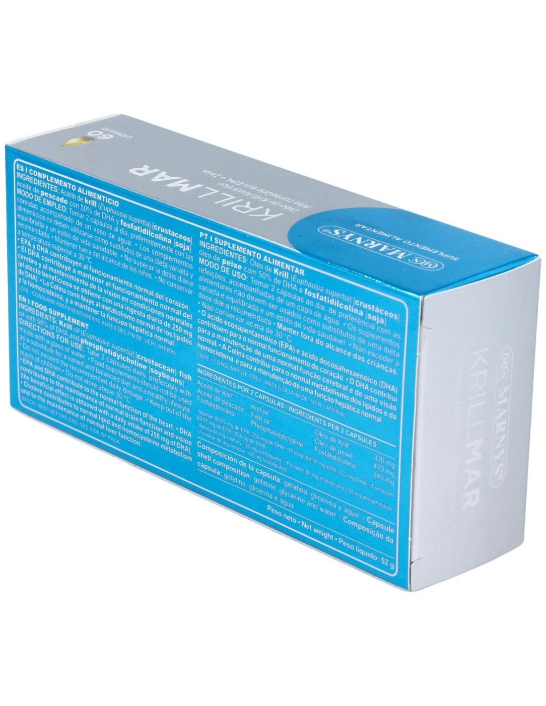 MARNYSKrillmar 60Perlas de Marnys es un suplemento nutricional para personas que buscan apoyar su salud cardiovascular y articular, formulado con aceite de krill que aporta ácidos grasos omega-3 y antioxidantes naturales.