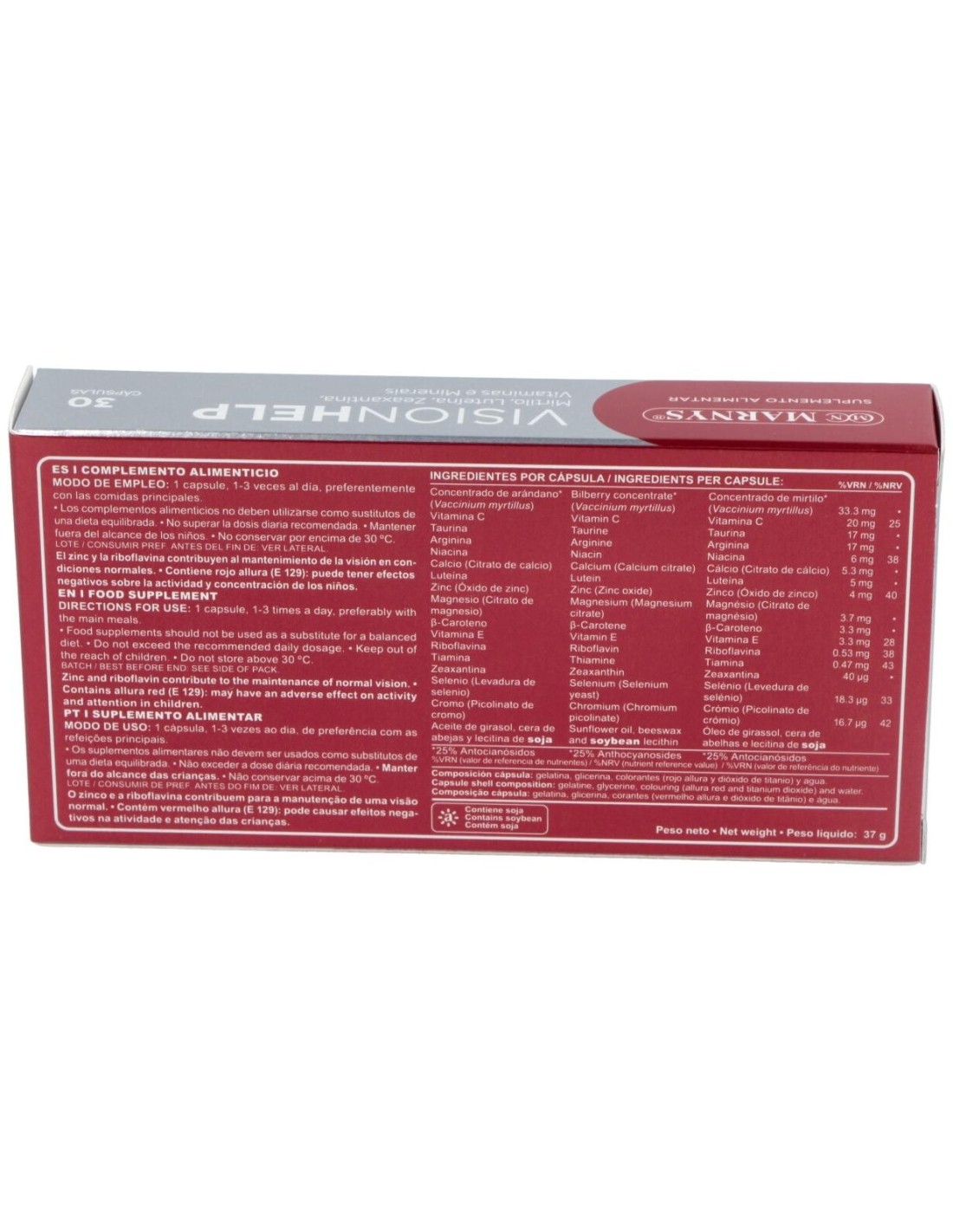 Este producto combina diferentes nutrientes empleados tradicionalmente para mantener la salud de la vista como la luteína, el beta-caroteno y la zeaxantina, carotenoides implicados en el funcionamiento de la vista, la mácula y la retina. Además son potentes antioxidantes y ayudan a proteger los ojos de las agresiones externas como los rayos ultravioleta. VisionHelp también proporciona cantidades importantes de vitaminas y minerales antioxidantes como la vitamina E o el selenio. Composición por cápsula: