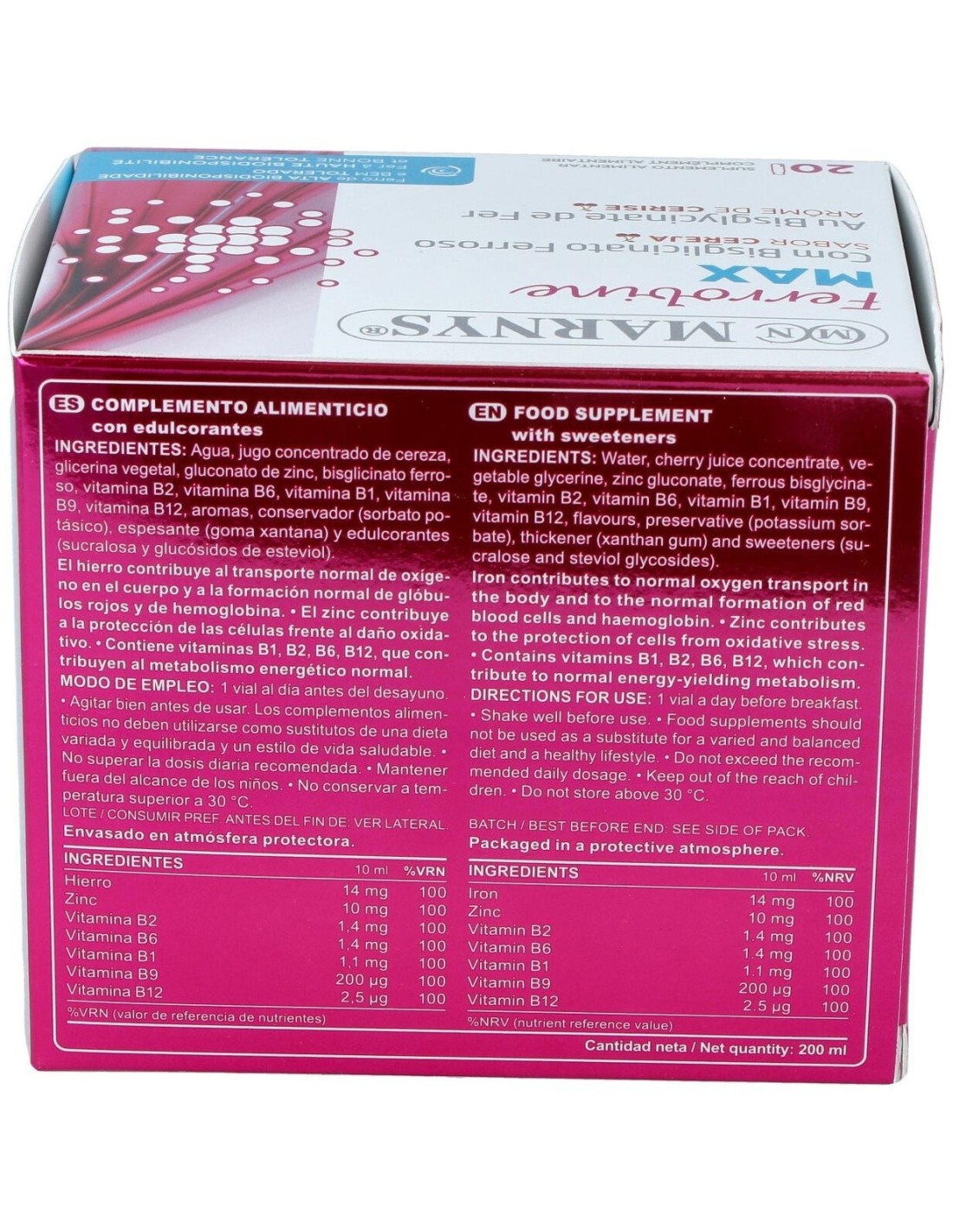 Suplemento nutricional diseñado para mejorar la absorción de hierro en el cuerpo y prevenir los estados de anemia, cansancio y fatiga. Contiene un agradable sabor a cereza. Enriquecido con zinc, bisglicinato ferroso, vitamina B2, B6, B1, B9 y B12. Las vitaminas del grupo B ayudan al normal funcionamiento del sistema inmunitario y a disminuir el cansancio y fatiga. Favorece la función psicológica normal y participa en la formación de glóbulos rojos y del sistema nervioso.