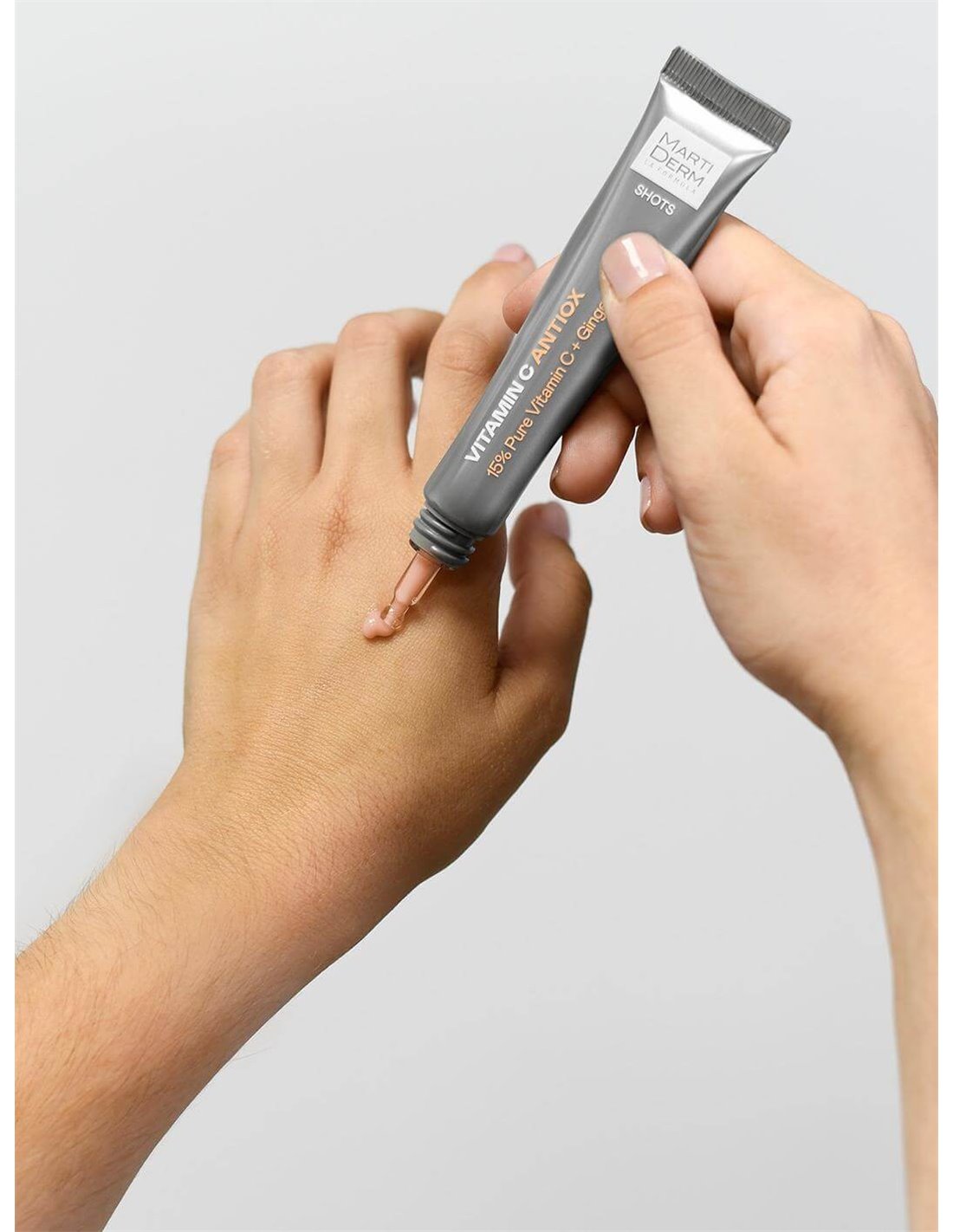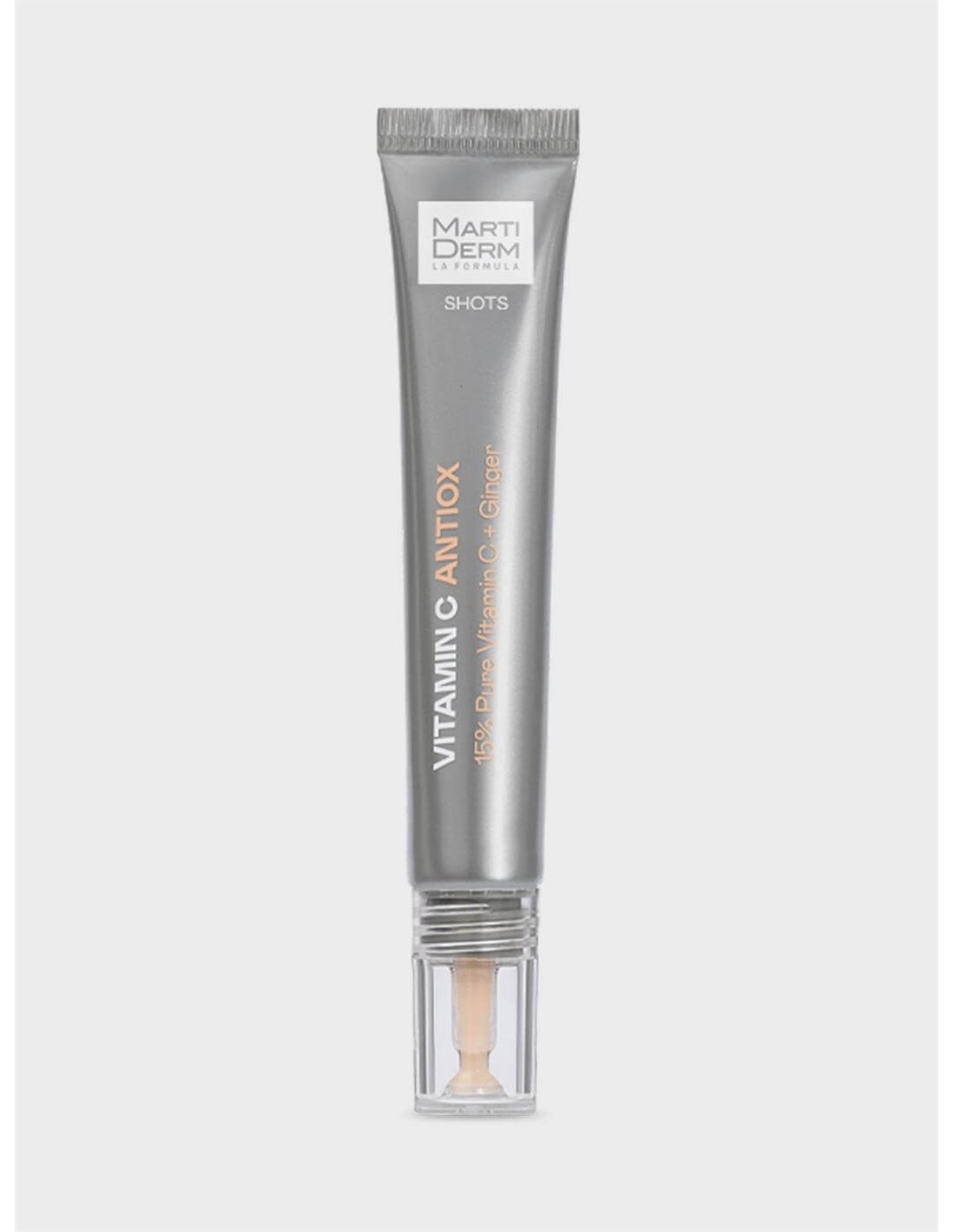 Martiderm Shot Vitamin C Antiox 20ml es un tratamiento facial que contribuye a acelerar el proceso de formación natural de las fibras de sostén de la epidermis.Elaborado a base de vitamina C y extracto de raíz de jengibre, que favorece la protección antioxidante de las células cutáneas frente a las agresiones de los radicales libres.