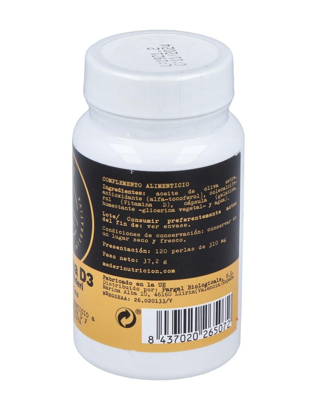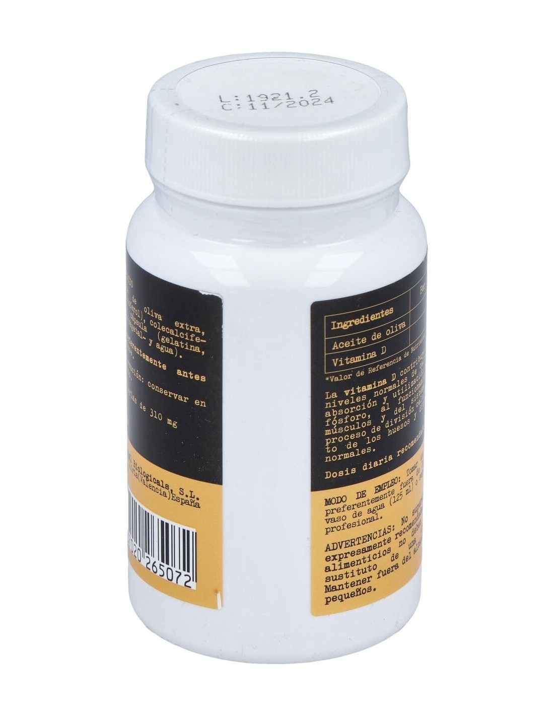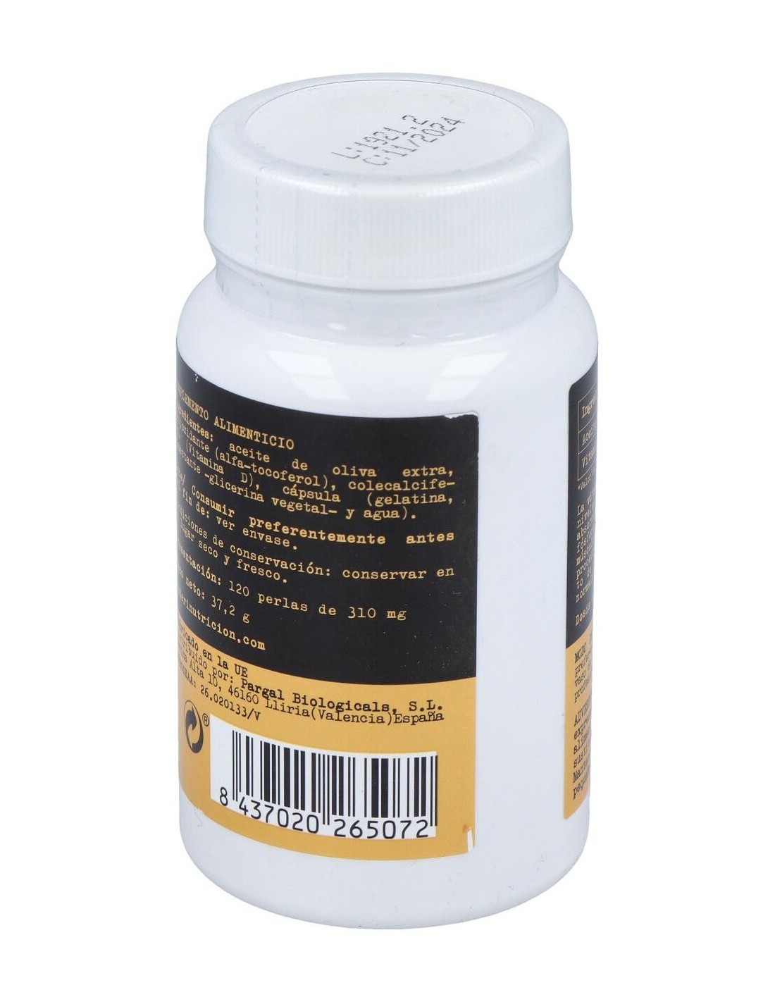 Aceite de oliva virgen extra, Antioxidante (D-alfa-tocoferol) y colecalciferol (Vitamina D). Perla: Gelatina bovina, Humectante: glicerina vegetal y agua.