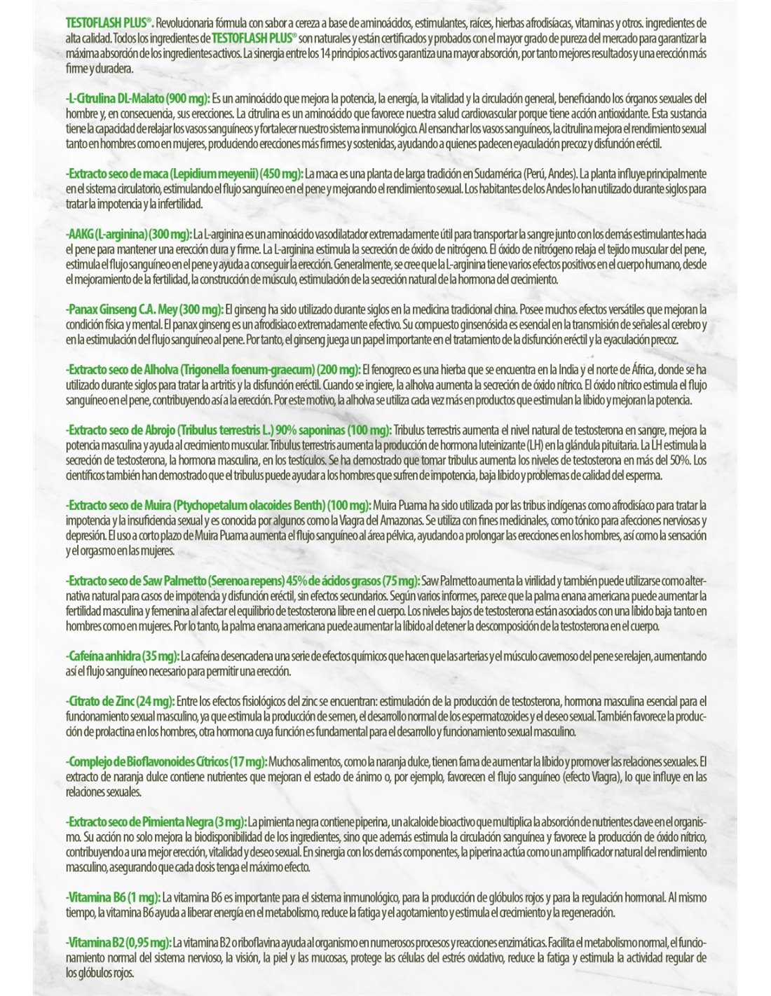 Testoflash® es la mejor solución para revitalizar tu vida sexual, siendo ahora mismo el potenciador sexual más vendido debido a su máxima capacidad vasodilatadora y estimulante del deseo sexual. Fórmula tres veces más rápida que cualquier producto similar, ya que se consume directamente por vía oral. La velocidad de absorción y la gran carga en óxido nítrico y estimulantes de la testosterona consiguen una erección más fuerte y permanente minutos después de ingerir el gel.Beneficios de TestoFlash®:Ayuda también a reducir el tiempo de recuperación después del orgasmo, así como el control de la eyaculación. Los 14 ingredientes de Testoflash® están certificados y testados con el mayor ratio de pureza del mercado para garantizar la máxima absorción de los principios activos.La sinergia entre los 14 ingredientes activos garantiza una mayor absorción y de ese modo un resultado más óptimo. Numerosos estudios científicos han confirmado y demostrado la efectividad en la acción de los ingredientes de Testoflash® y su importancia para la potencia y testosterona masculina.Testoflash® al ser un producto natural no tiene efectos secundarios que productos similares normalmente producen. Desarrollado científicamente y pionero en combatir las causas de la impotencia y la mejora de tu salud general.Testoflash® es un complemento que:
