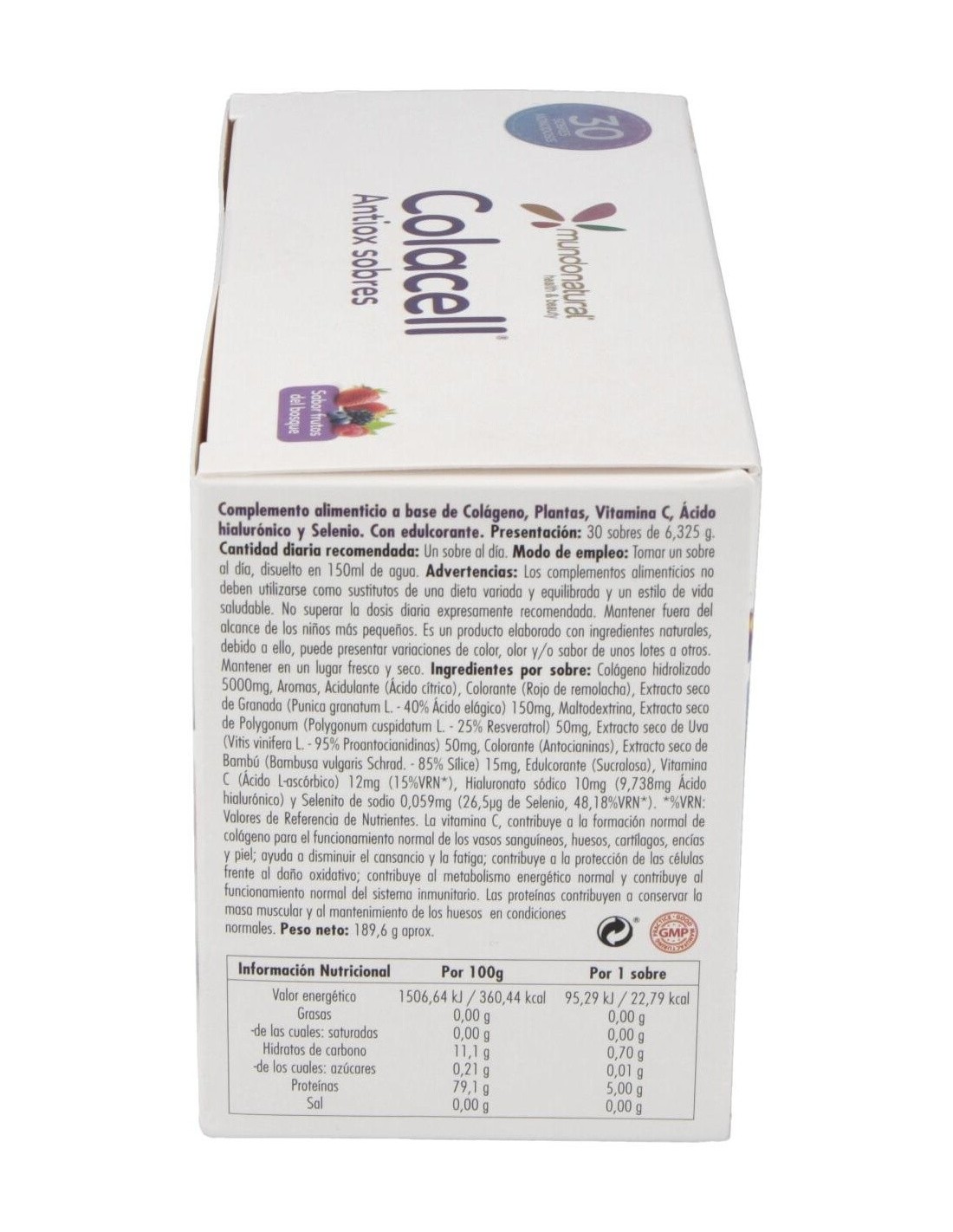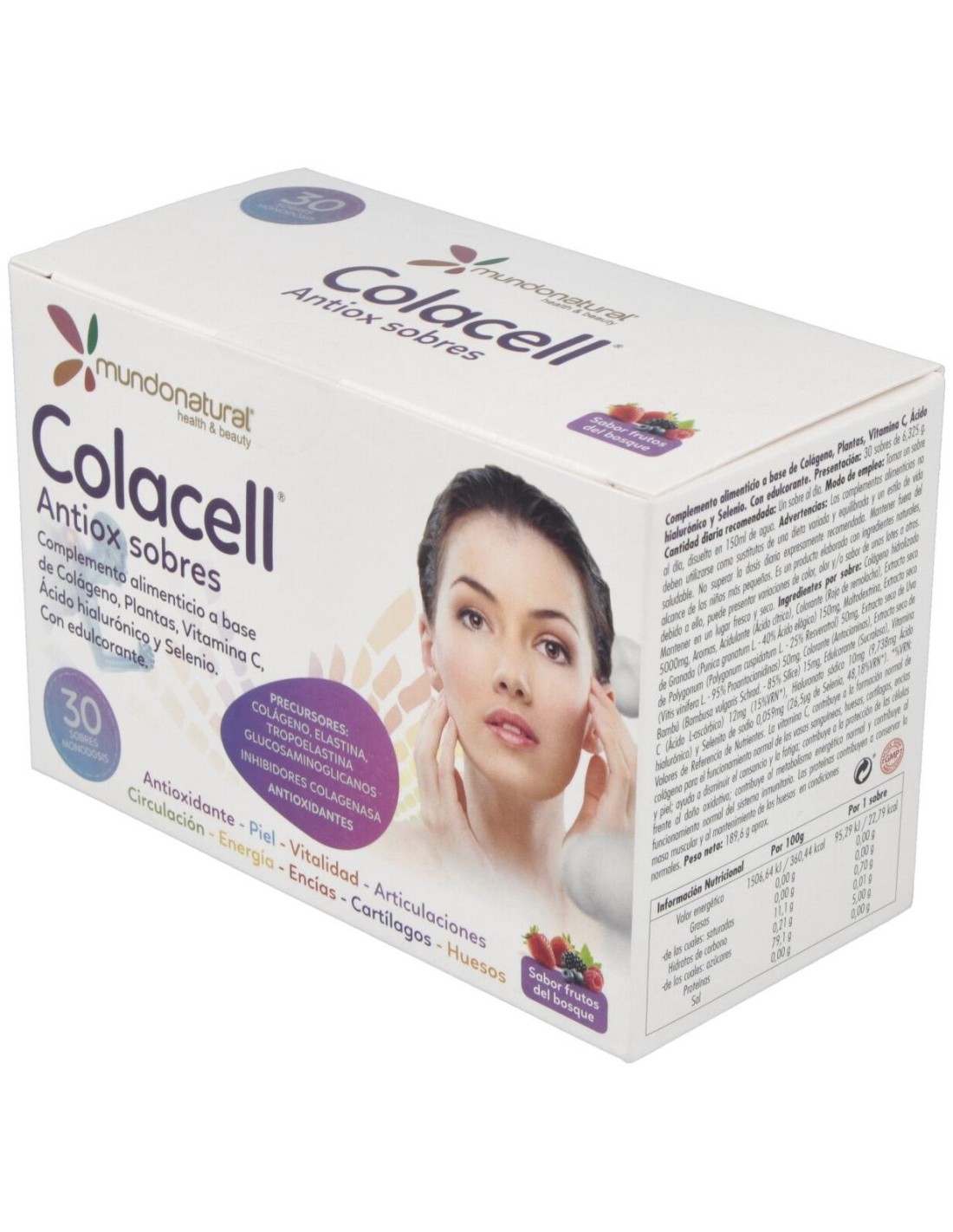 Colacell Antiox 30Sbrs. de Mundonatural es un suplemento diseñado para personas interesadas en apoyar su bienestar diario mediante ingredientes seleccionados que contribuyen a la salud general. Es adecuado para quienes buscan complementar su rutina con productos naturales que aportan antioxidantes.