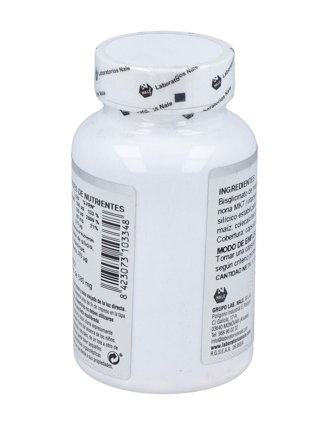 Bisglicinato de magnesio 400 mg, ácido ortosilícico estabilizado 25 mg, almidón de maíz, menaquinona 7 (vitamina K2) 50 mg y colecalciferol (vitamina D3) 20 µg. Cobertura: cápsula de celulosa.