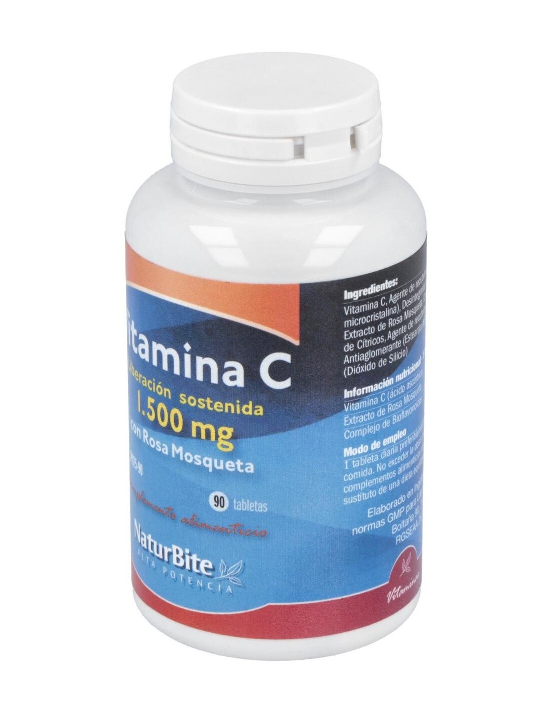 Vitamina C (1500 mg), Complejo de bioflavonoides (25 mg), Extracto de rosa mosqueta (20 mg), Dióxido de Silicio, Estearato de magnesio, Celulosa microcristalina, Croscarmelosa de sodio.