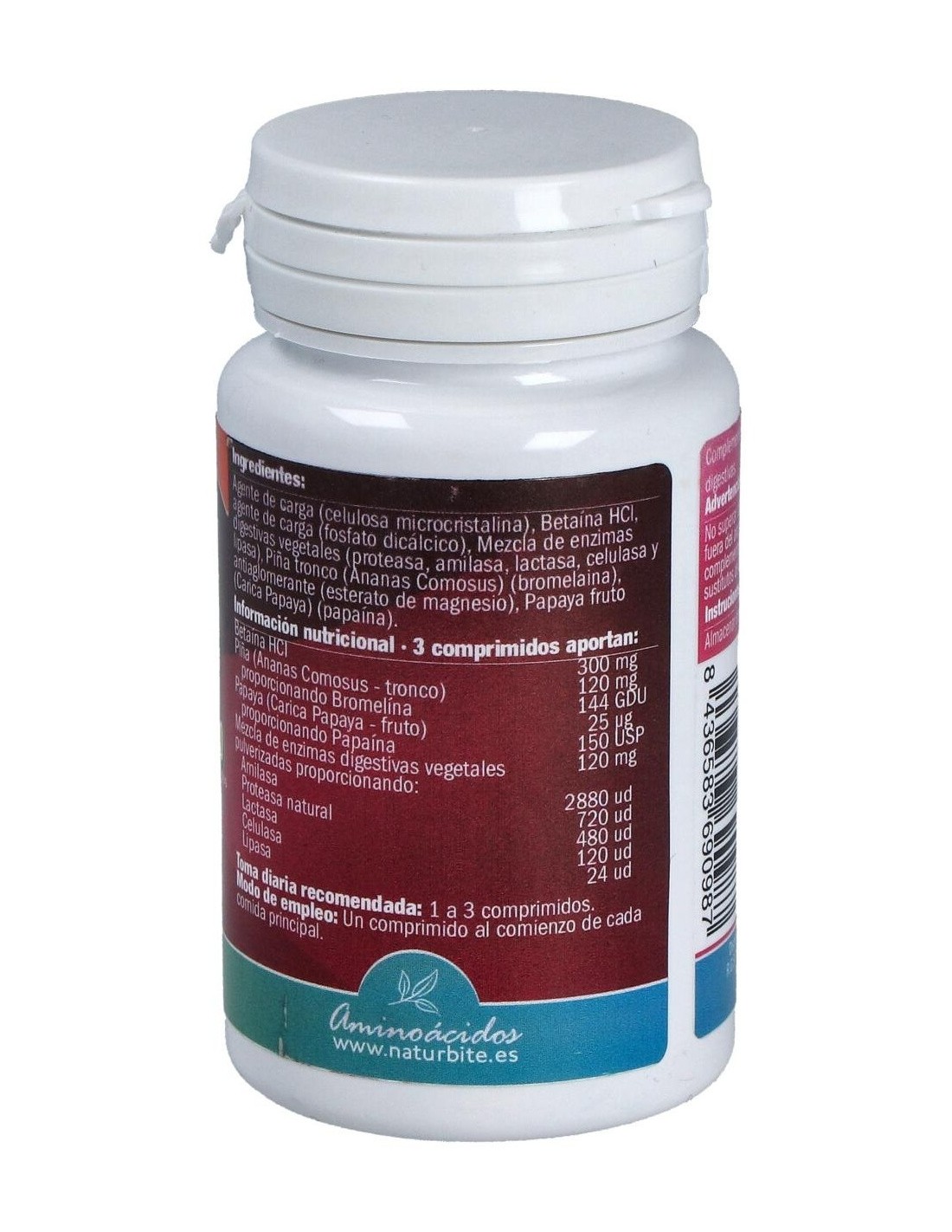 Celulosa microcristalina, Betaina HCI, fosfato dicálcico, mezcla de enzimas digestivas vegetales (proteasa, amilasa, lactasa, celulasa y lipasa), piña tronco, bromelaina, estearato de magnesio, papaya fruto, papaina.